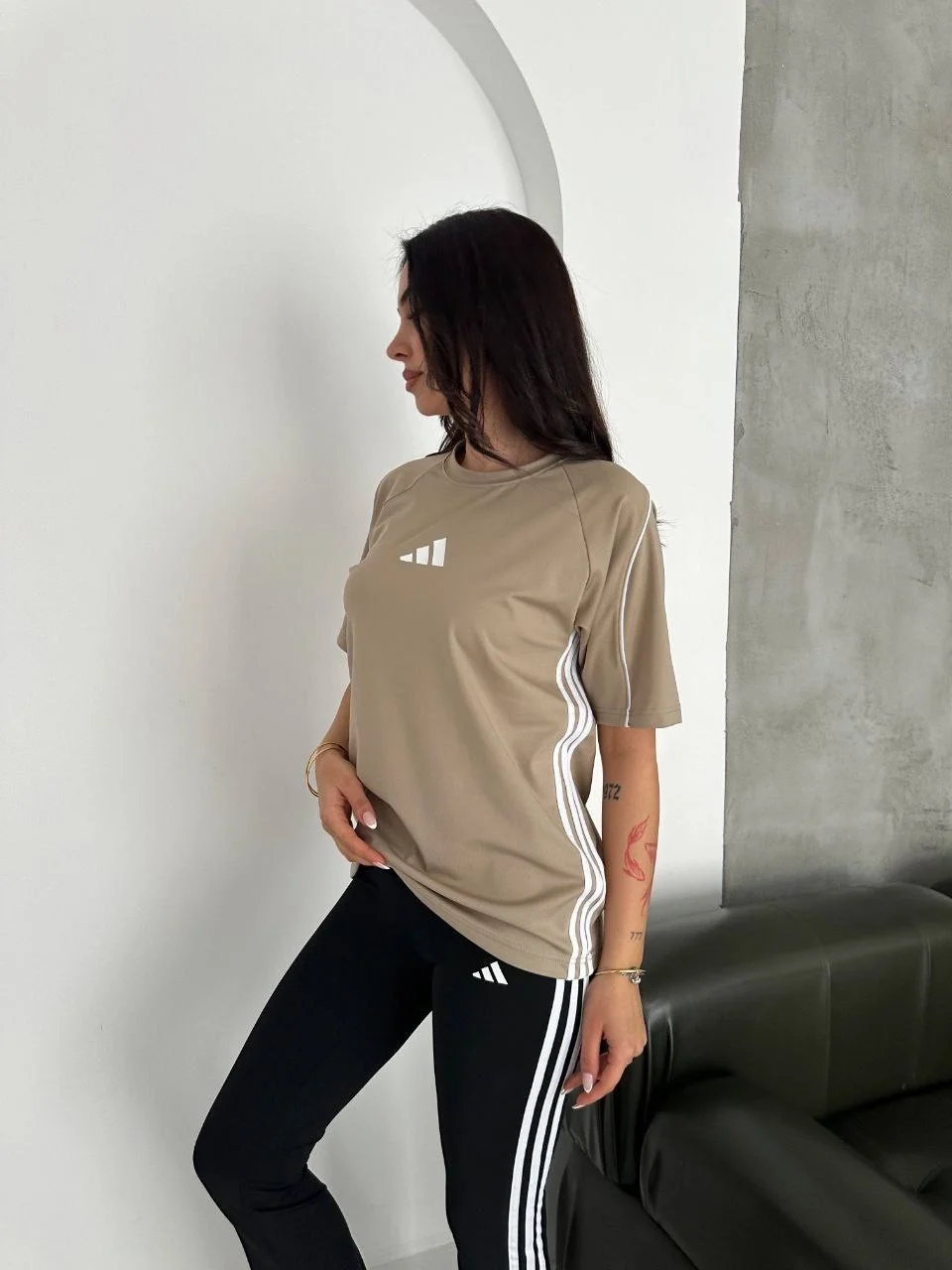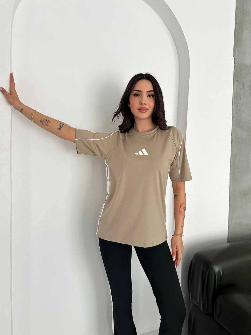Bej Şerit Detaylı Spor Tayt Oversize T-Shirt Takım