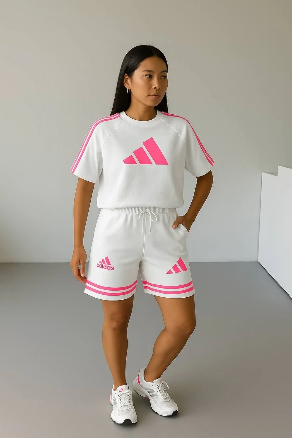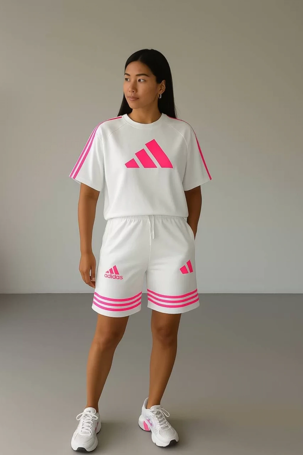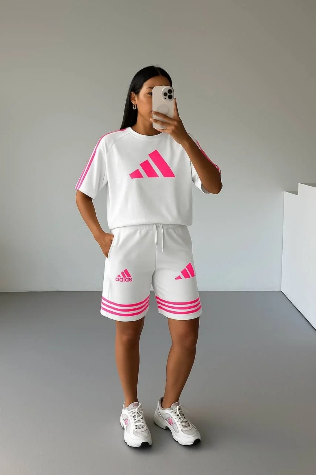 Beyaz ADD Fuşya Çizgili Oversize Unisex Şortlu Takım