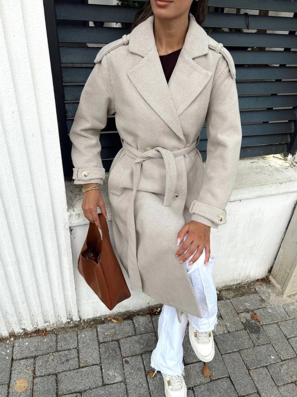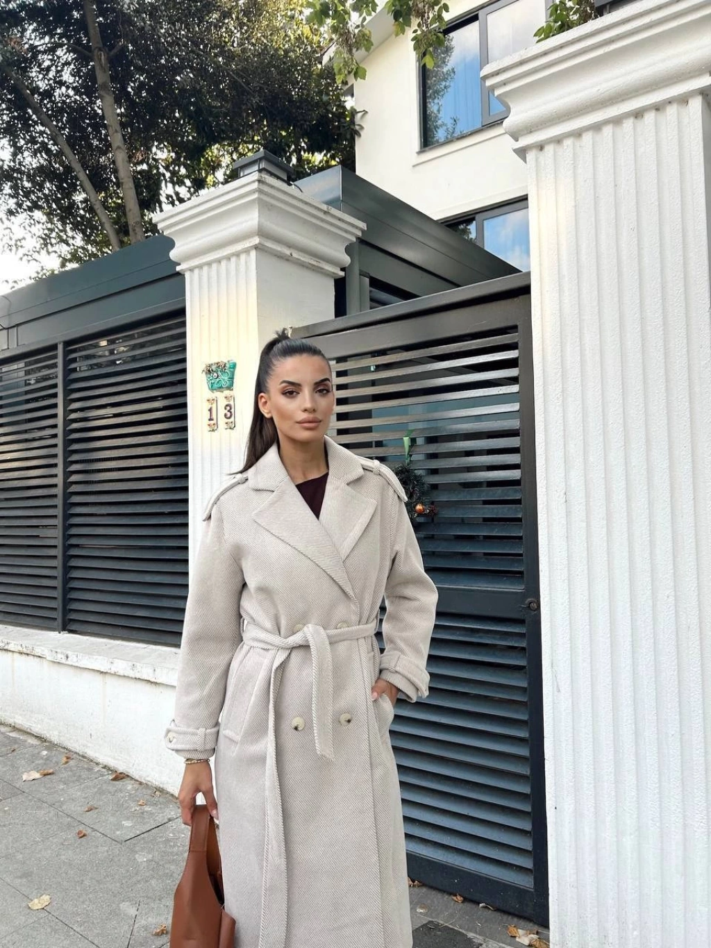 Krem Kuşaklı Astarlı Apoletli Kaban