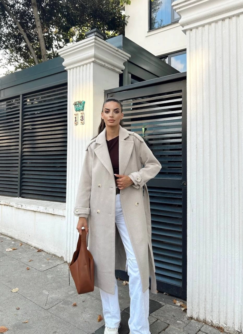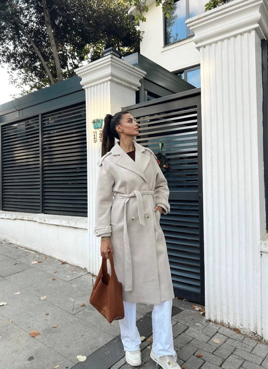 Beyaz Kuşaklı Astarlı Apoletli Kaban