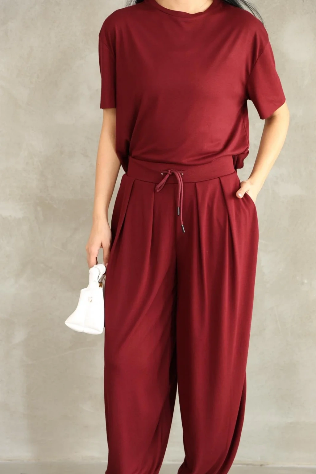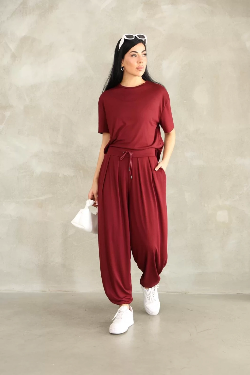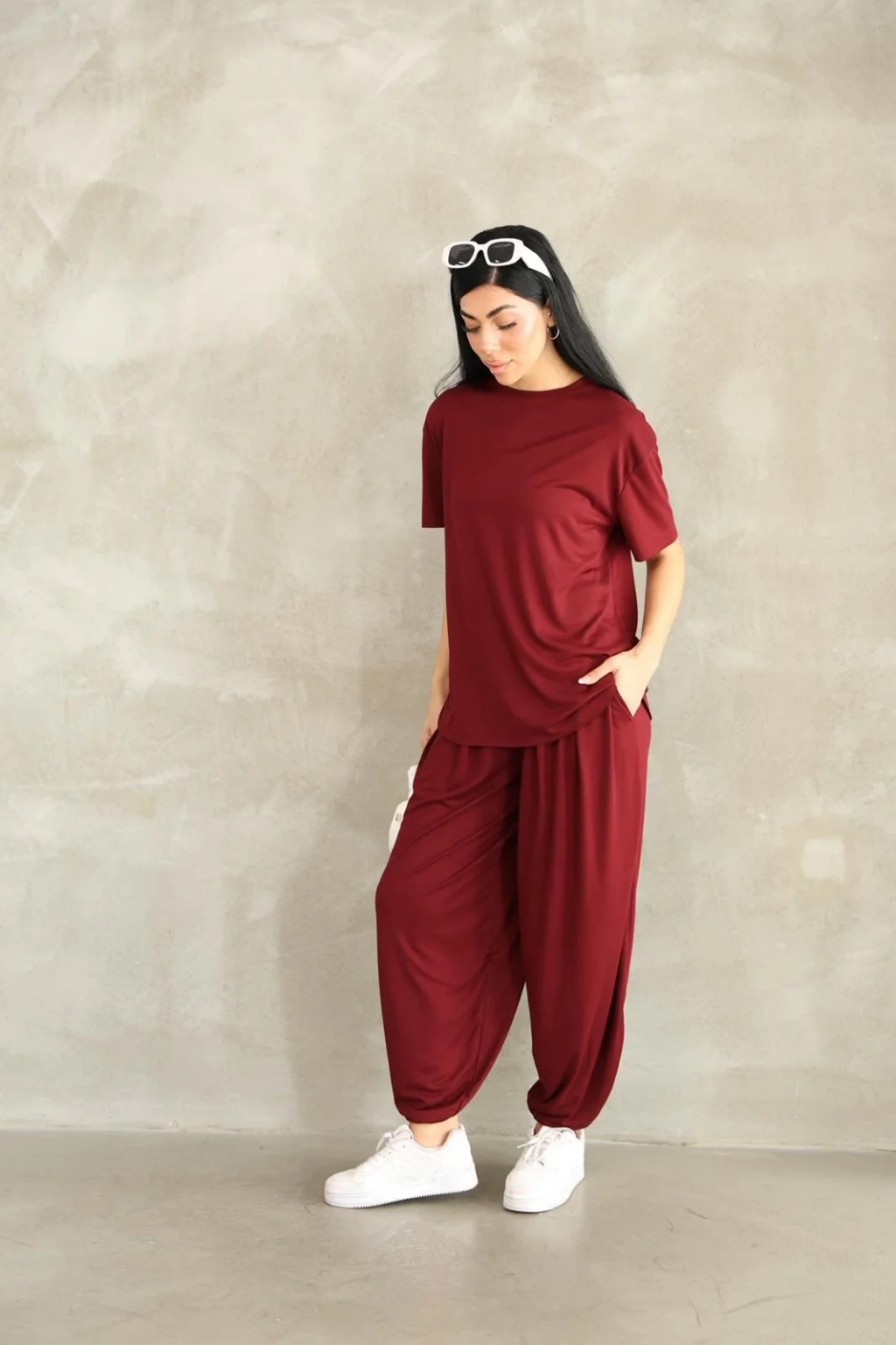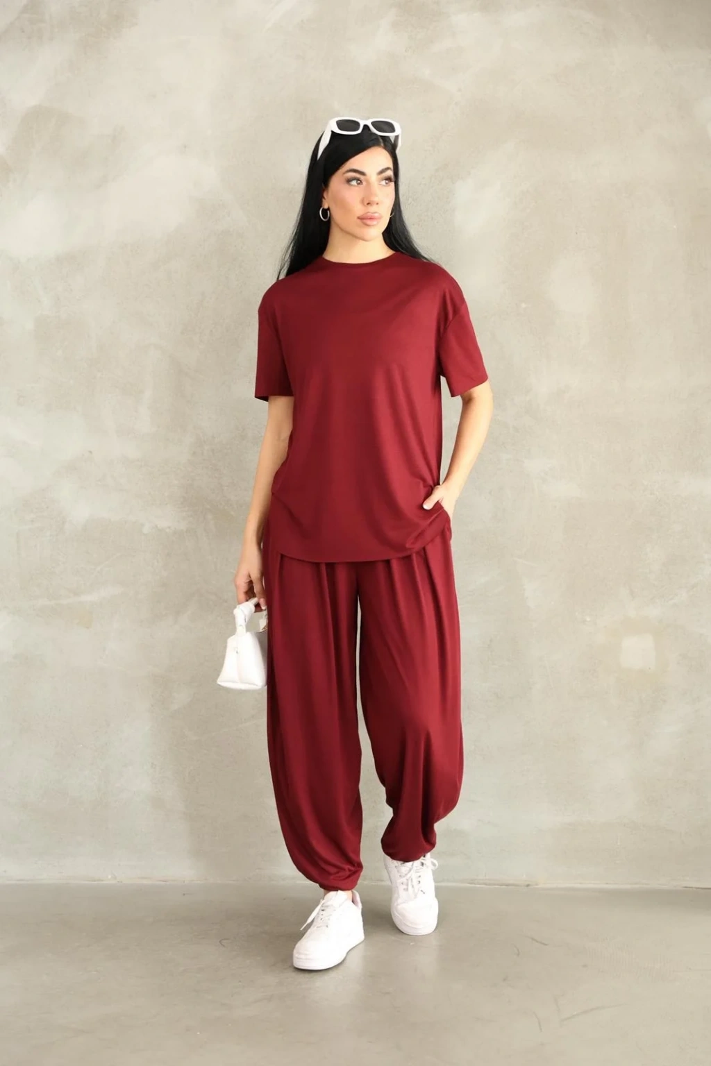 Modaskop Bordo Oysho Modal Kumaş Şalvar İkili Takım, şıklık ve rahatlığı bir arada sunar.
