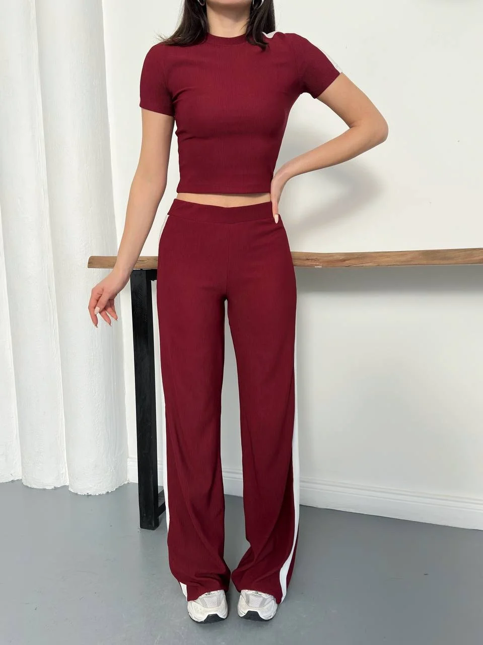 Bordo Yan Şerit Detaylı Yüksek Bel Bol Paça Tayt Takım