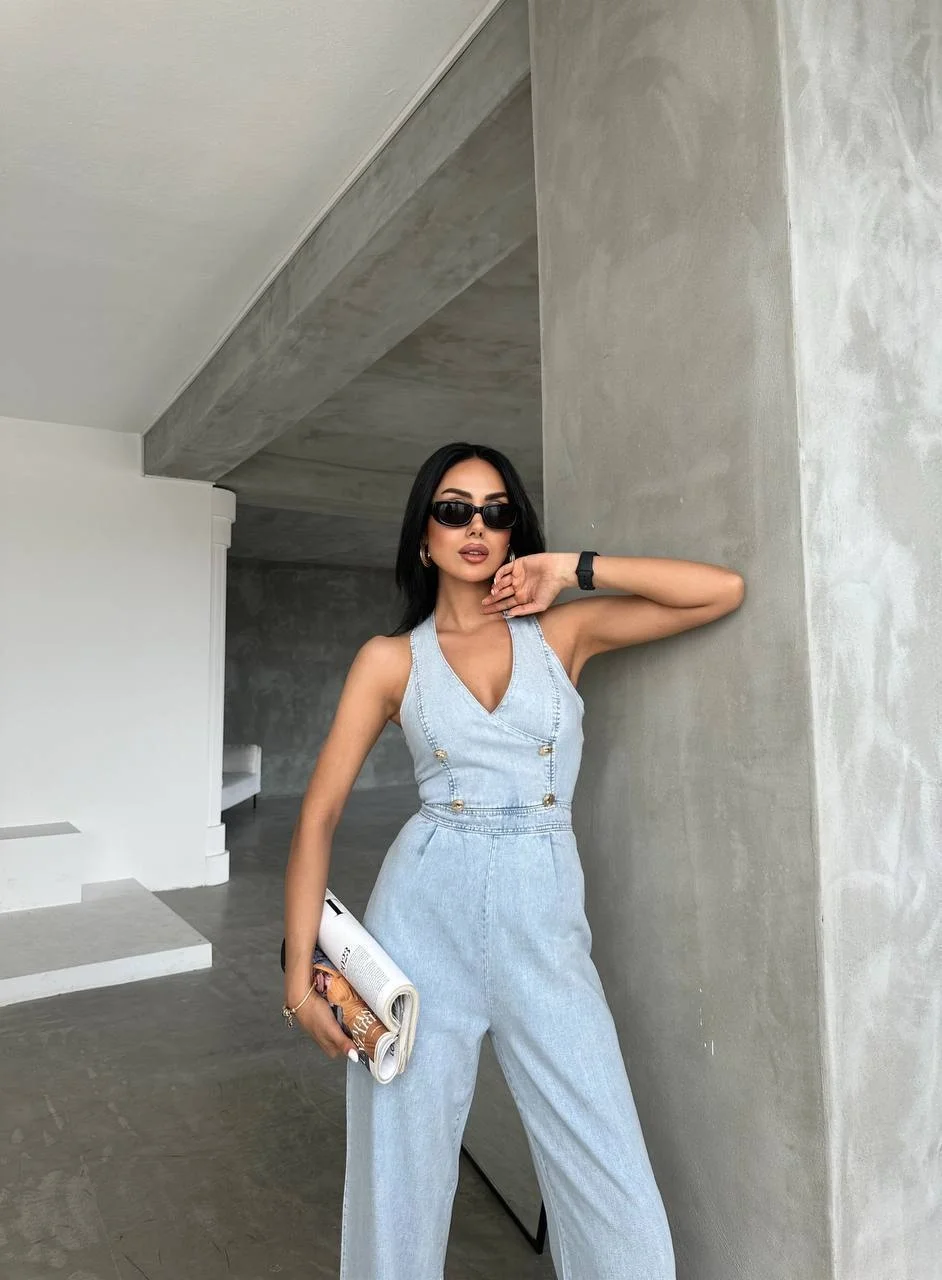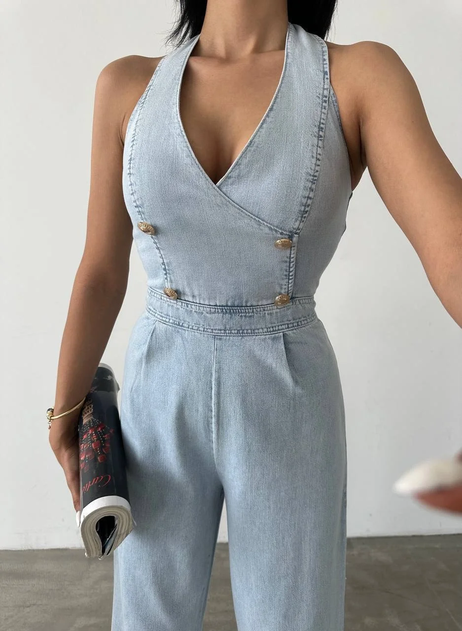 • Buz ithal tensel denim tulum Gold düğme