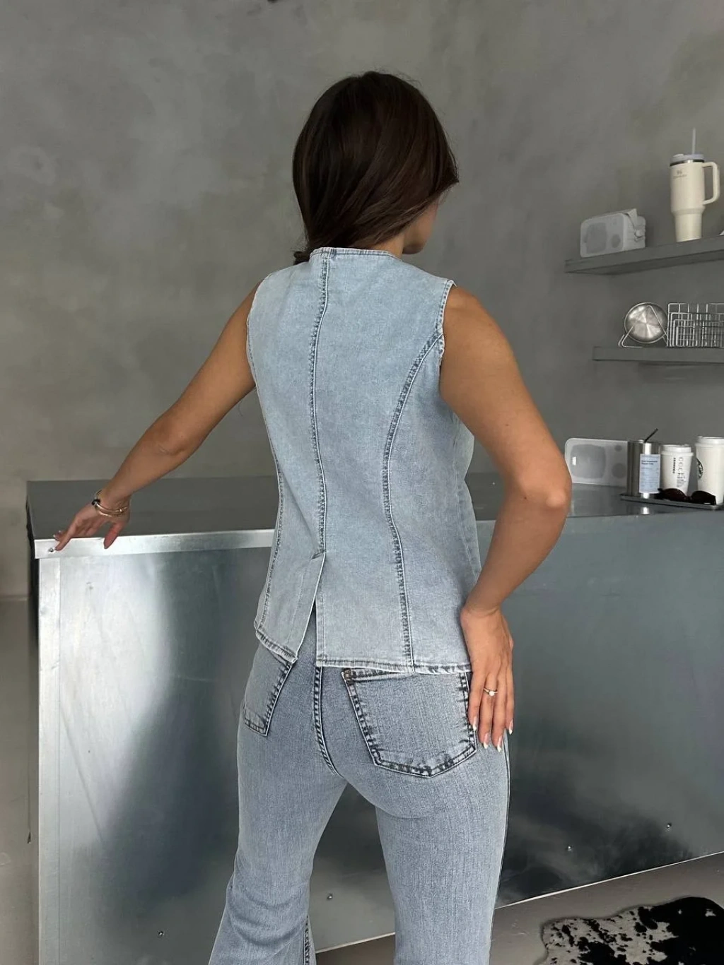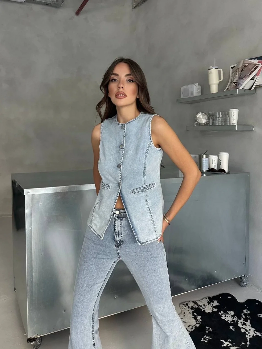 Modaskop'un Buz Mavi İspanyol Paça Yelekli Denim Takımı, şıklığı ve tarzı bir arada sunar.