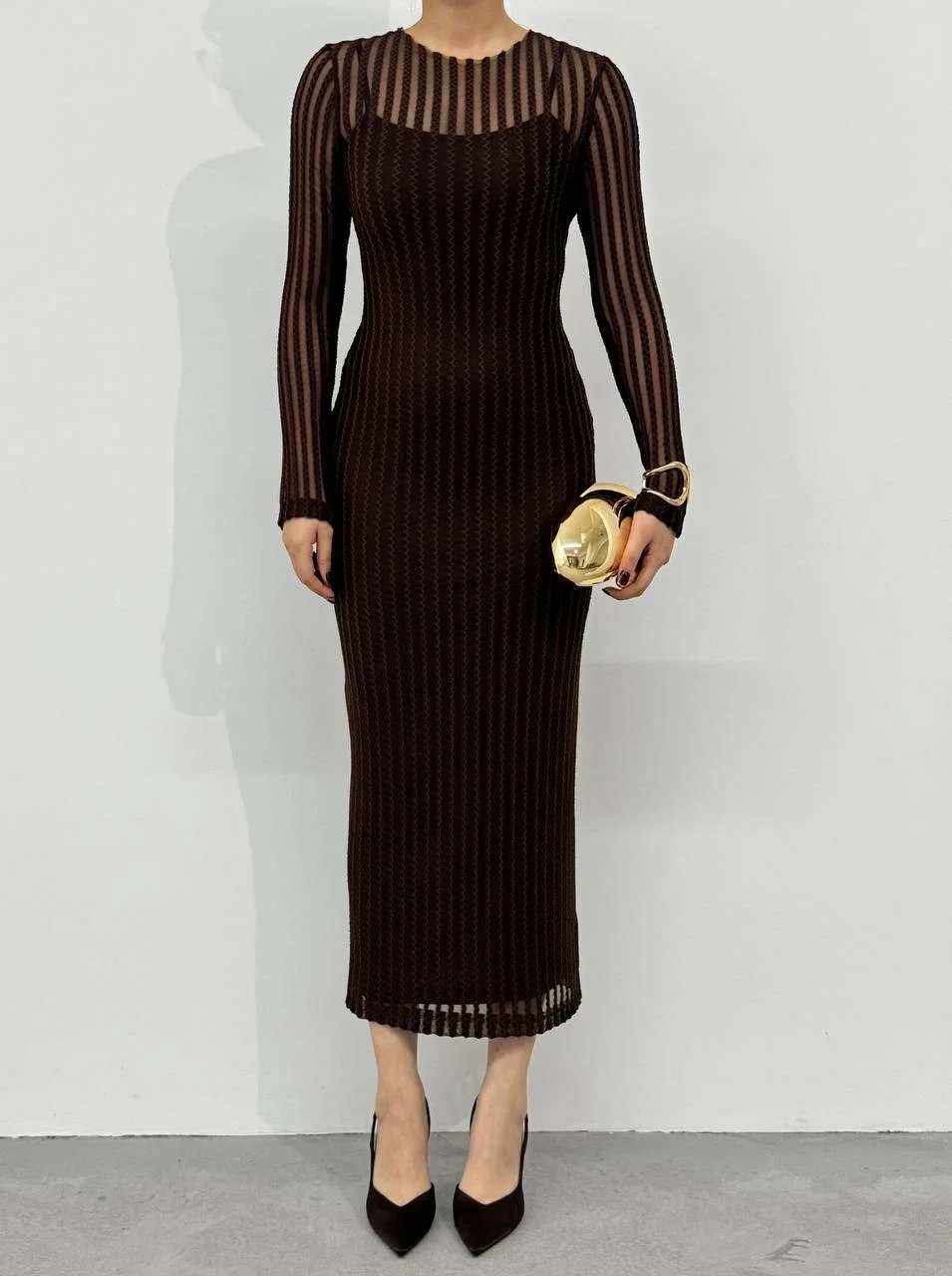 • Çikolata Kahvesi Transparan Dokulu Uzun Elbise