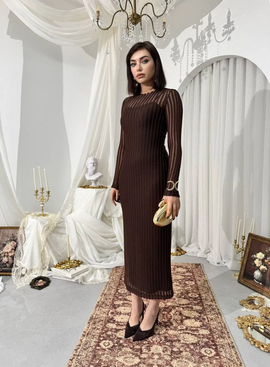 Çikolata Kahvesi Transparan Dokulu Uzun Elbise