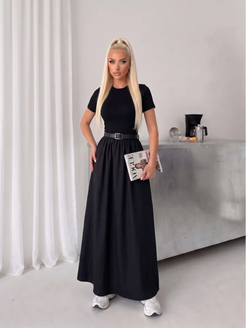 Siyah Poplin Kemer Detay Etekli Elbise
