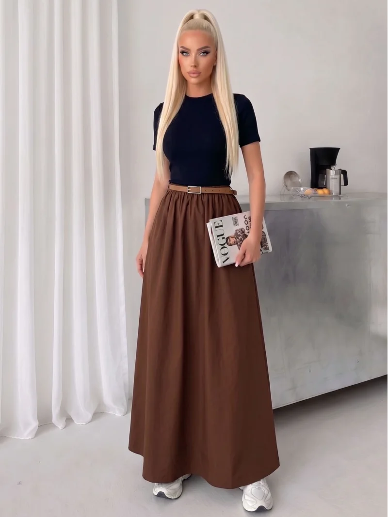 Kahve Poplin Kemer Detay Etekli Elbise