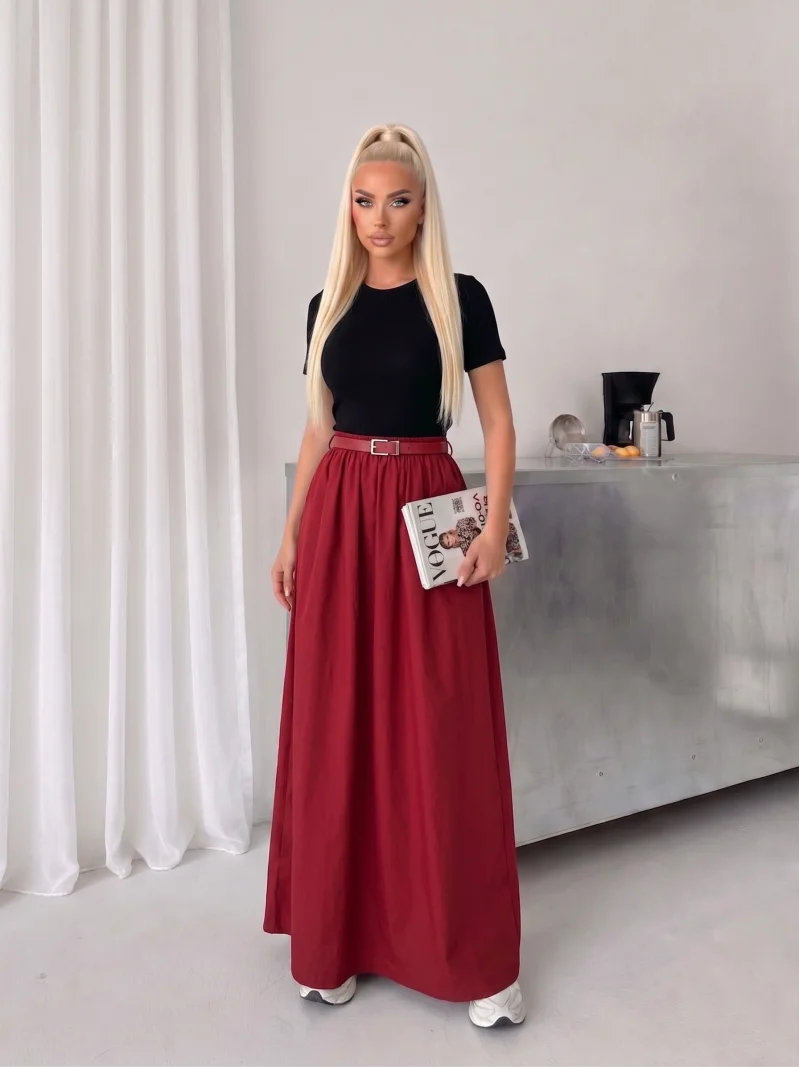 Bordo Poplin Kemer Detay Etekli Elbise