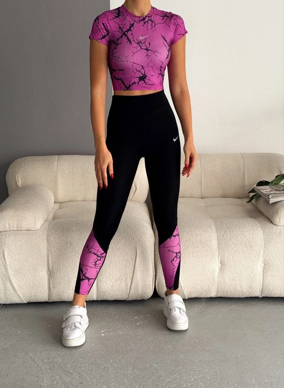 • Fuşya Mermer Desenli Yüksek Bel Spor Tayt Takımı – Şık ve Esnek Fitness Kombini
