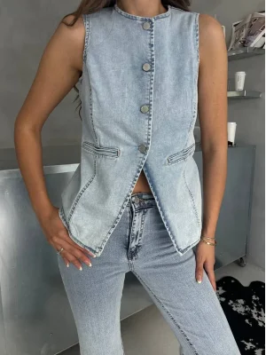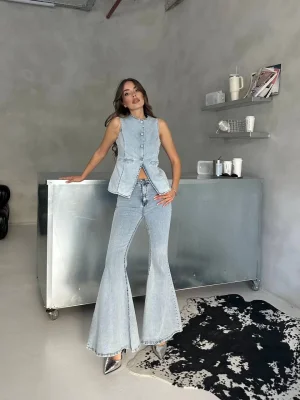 Buz Mavi İspanyol Paça Yelekli Denim Takım