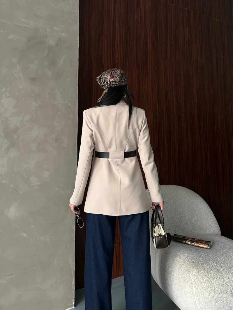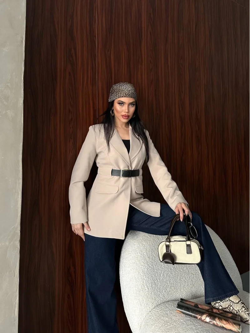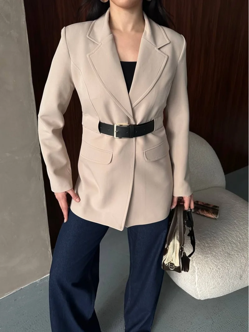 Krem Belden Kemerli Blazer Ceket Elbise | Premium Seri