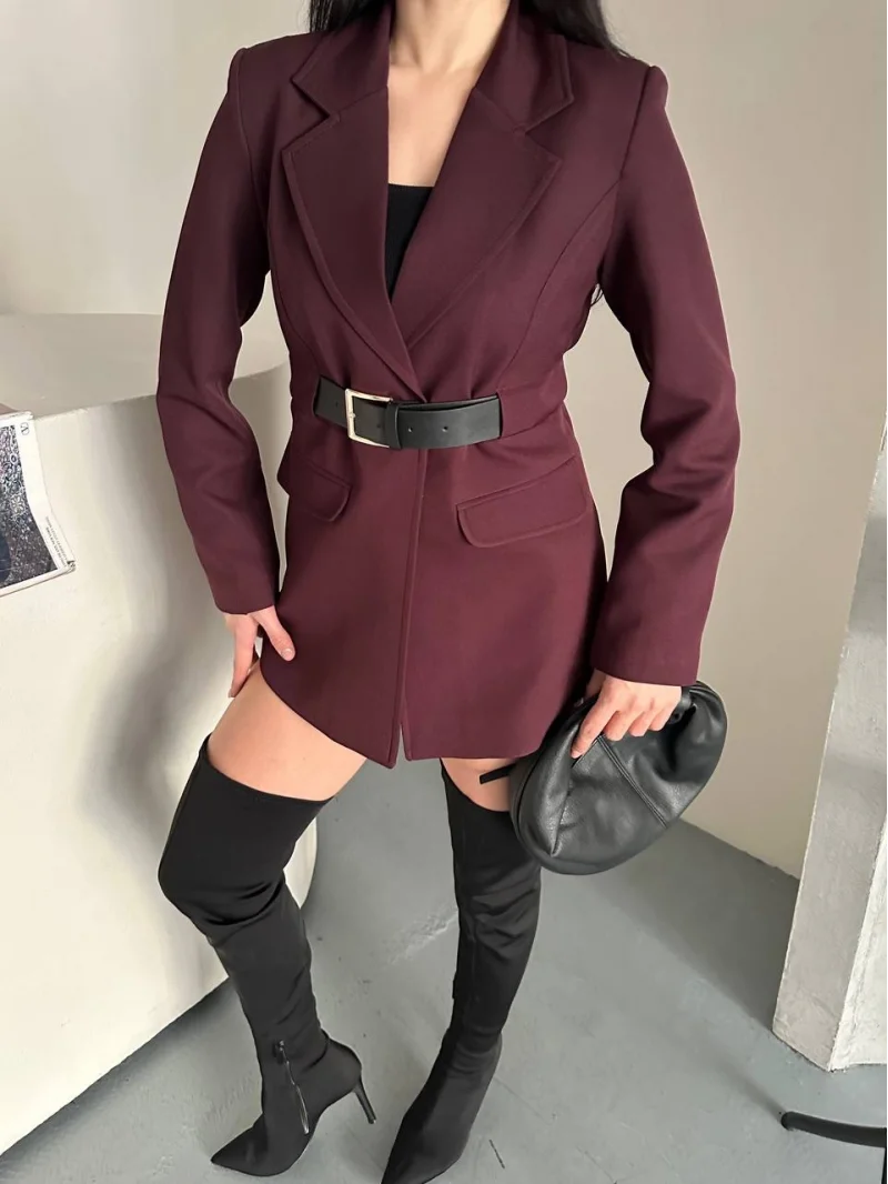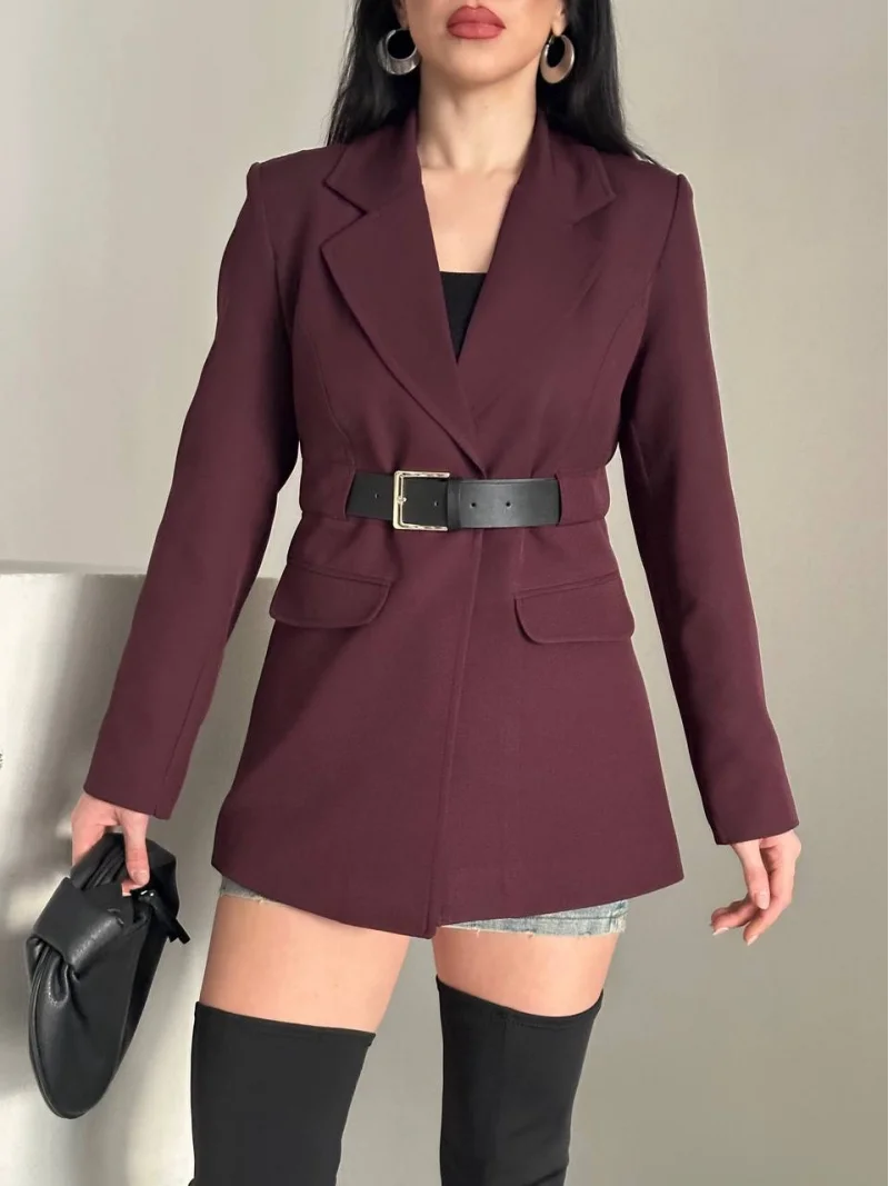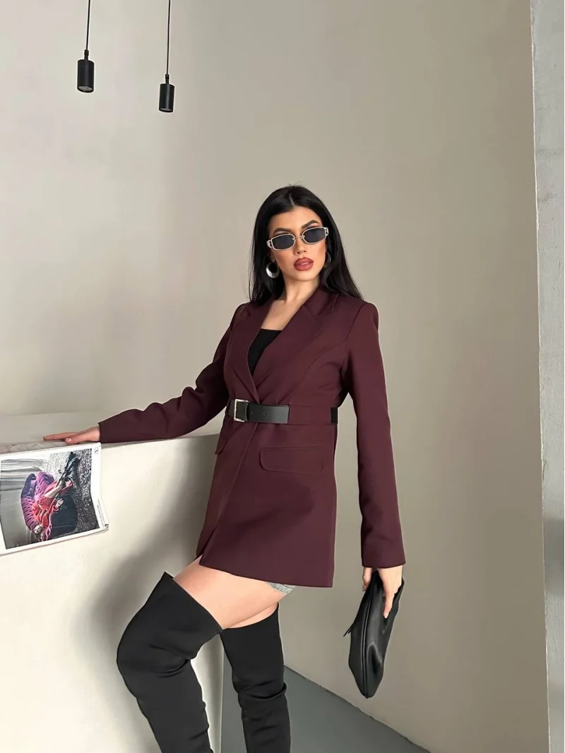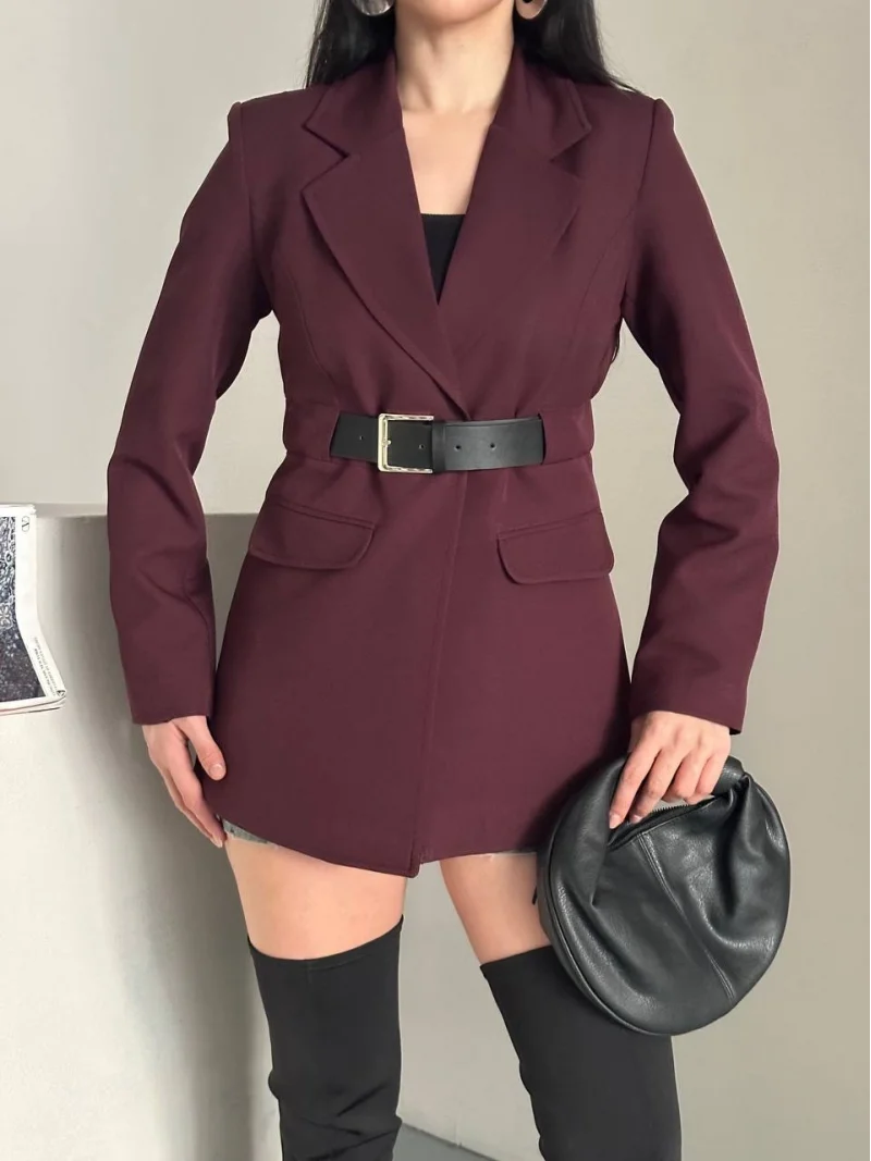 Taba Belden Kemerli Blazer Ceket Elbise | Premium Seri