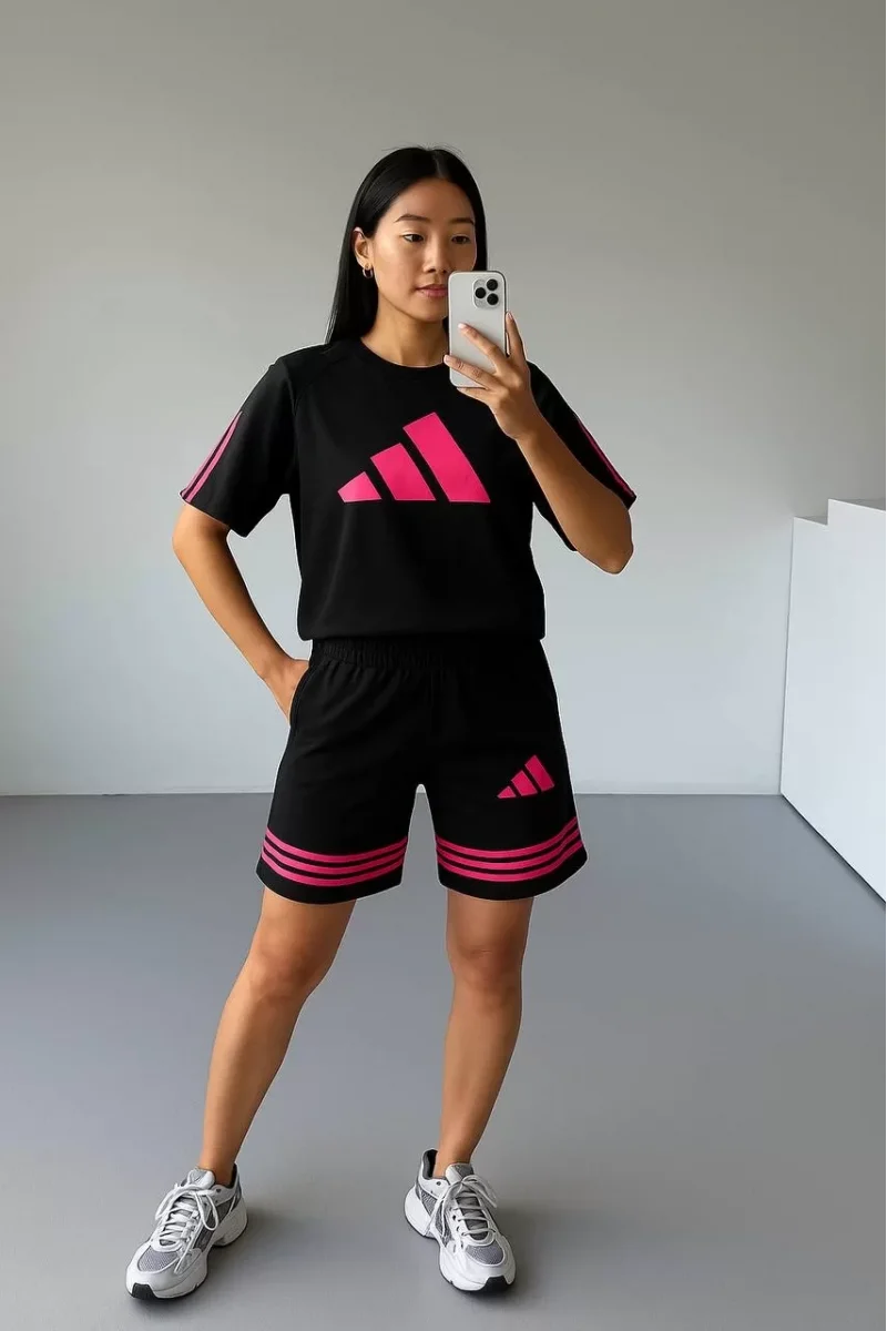 Siyah ADD Fuşya Çizgili Oversize Unisex Şortlu Takım