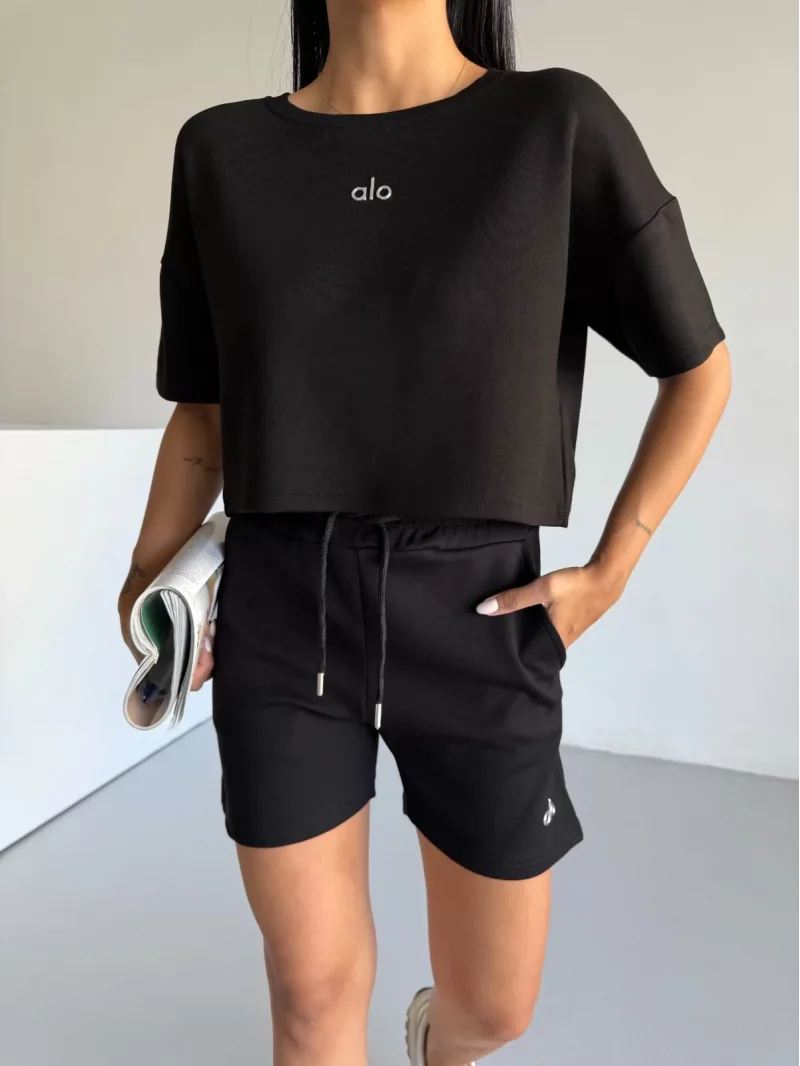 Siyah Alo Yoga Modal Crop Şortlu Takım