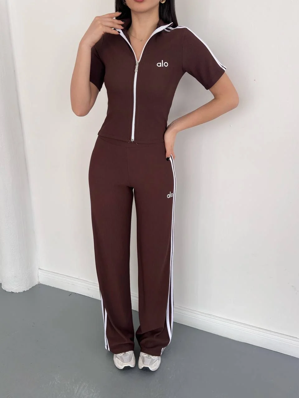 Kahve Fermuarlı Dik Yaka Yan Şeritli Spor Takım
