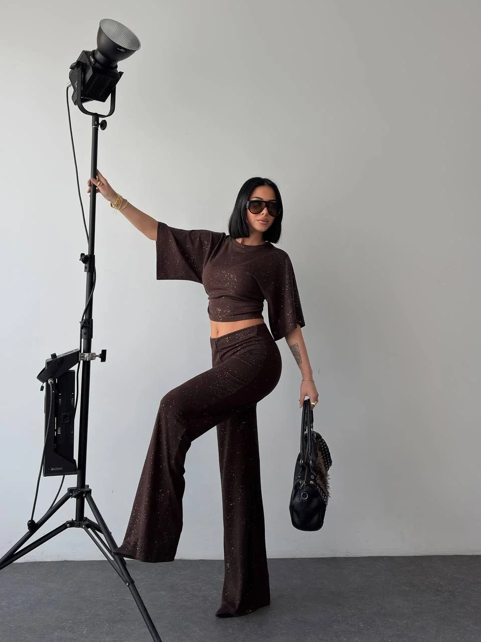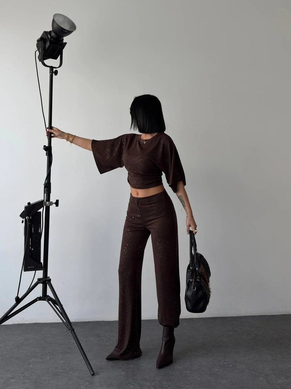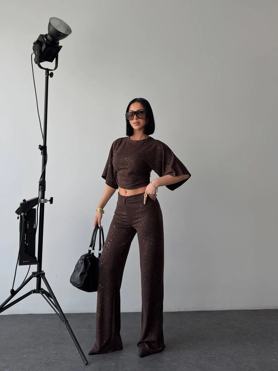 • Kahve Gece Işıltılı Simli Crop Takım