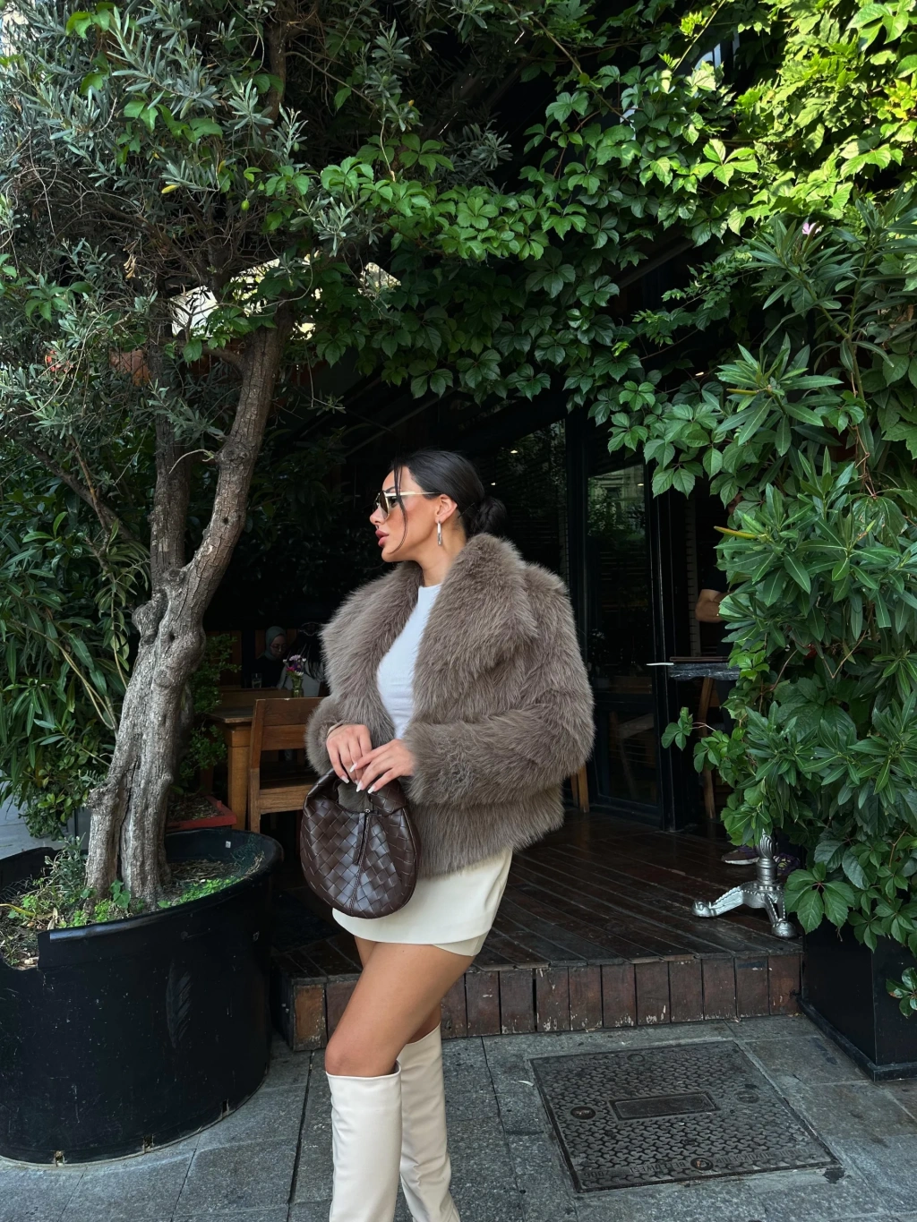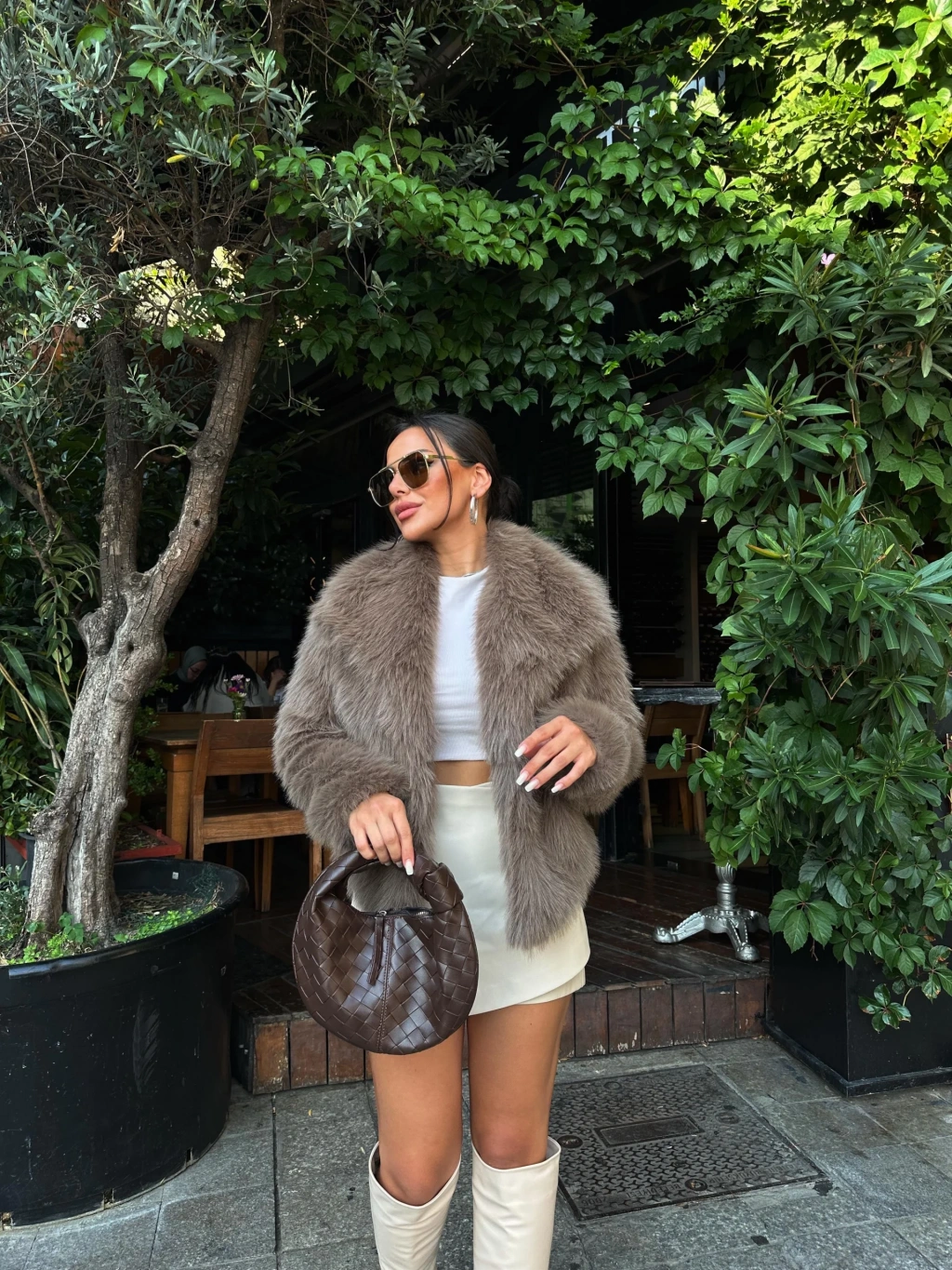 Beyaz Leopar Ceket Yaka İçi Satarlı Uzun Kürk Kaban