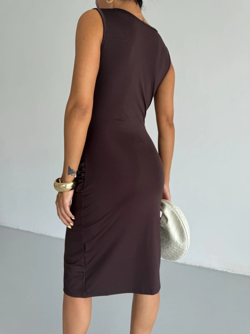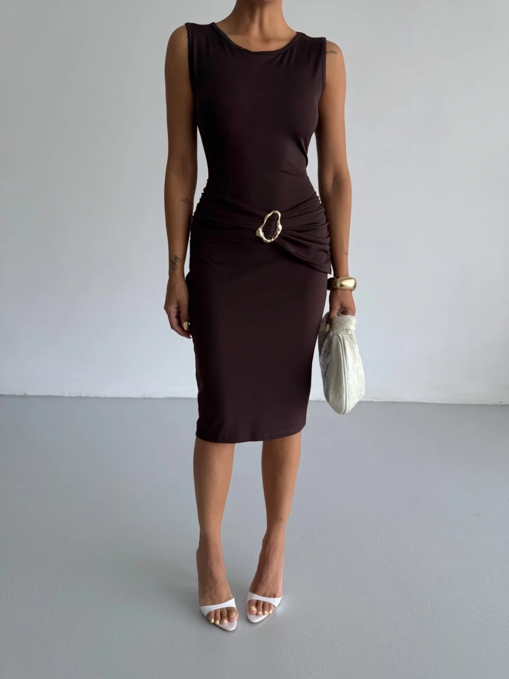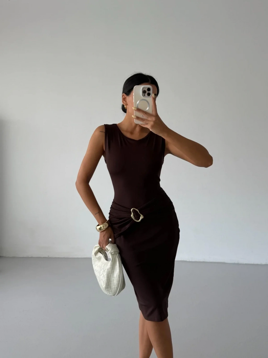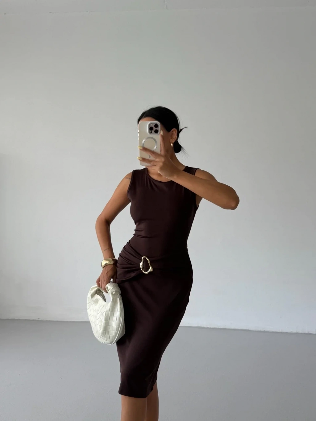Kahve Toka Detay Midi Boy Dalgıç Elbise - Zarif ve şık bir seçenek!