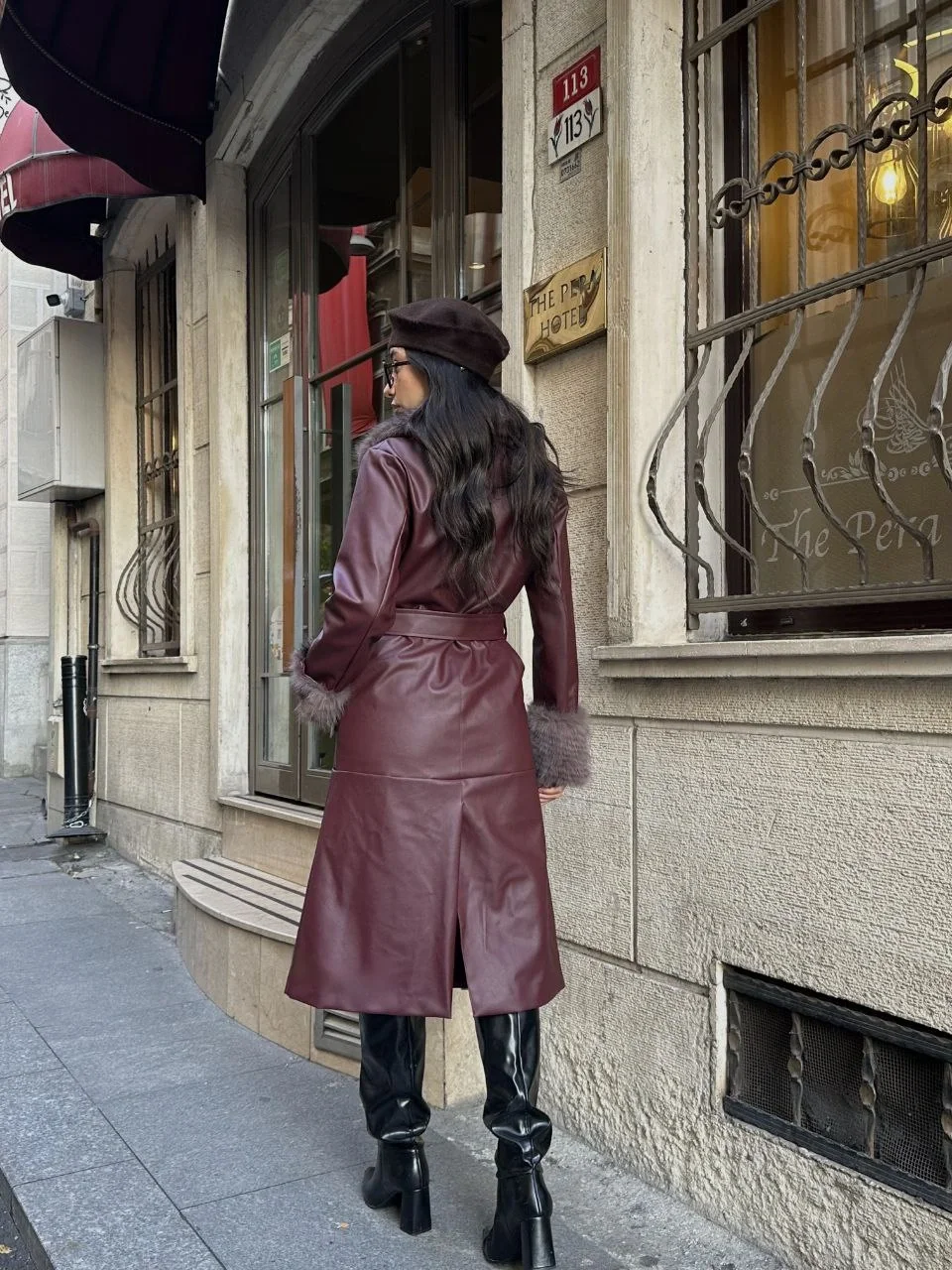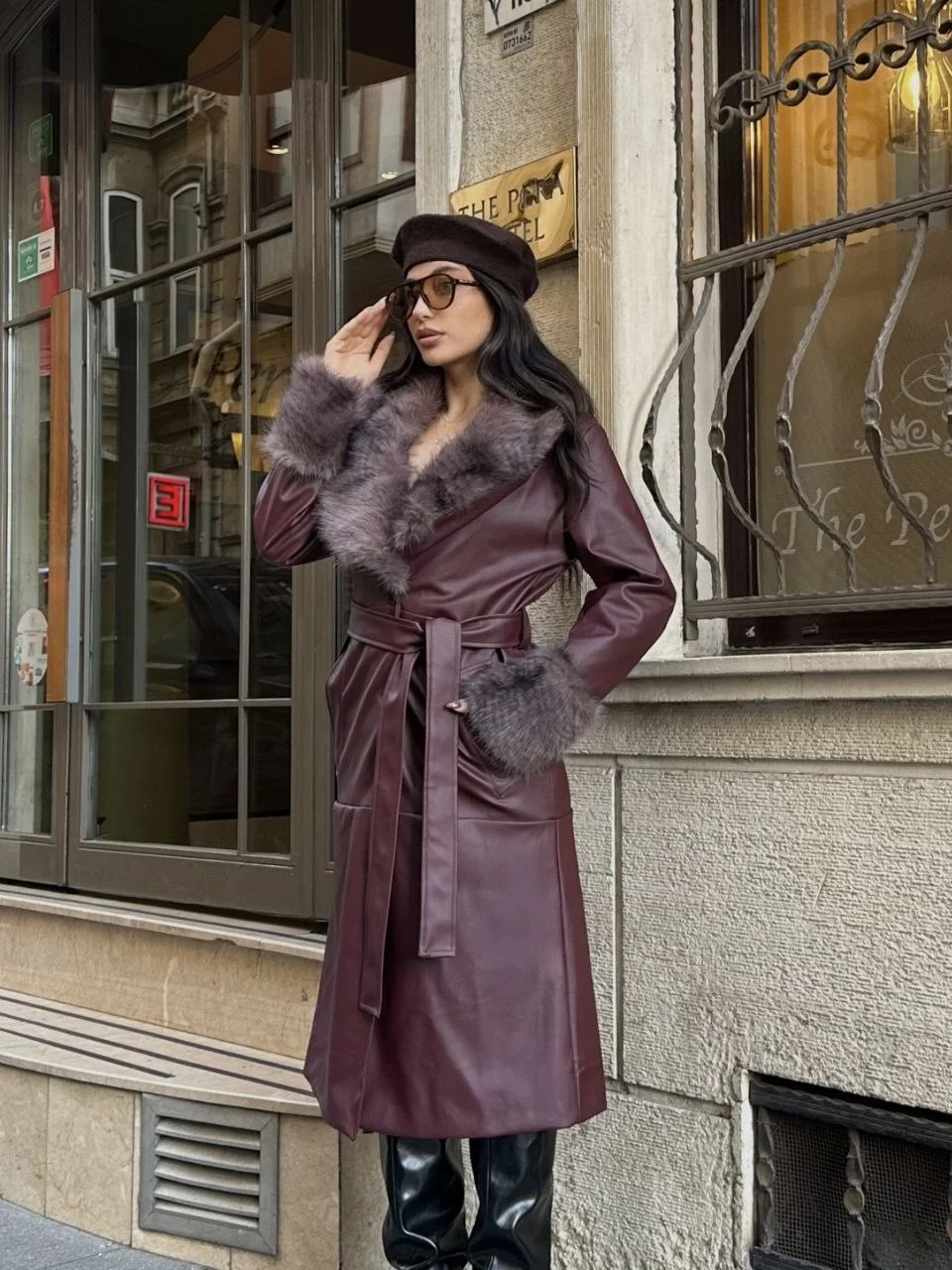 • Bordo Uzun Kemerli Kürklü Kaban Premium