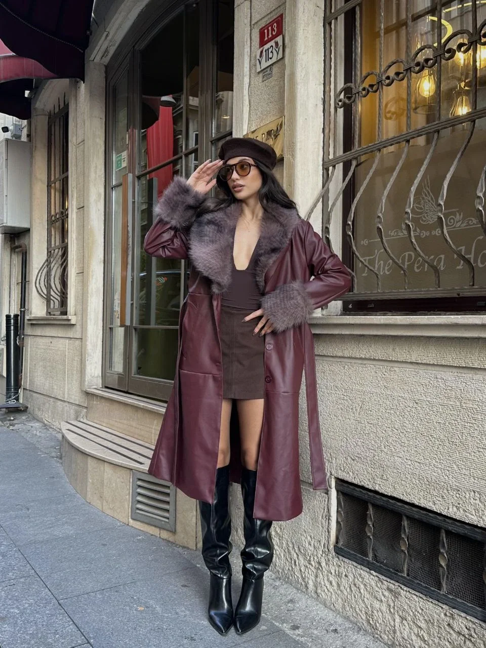 Bordo Uzun Kemerli Kürklü Kaban Premium