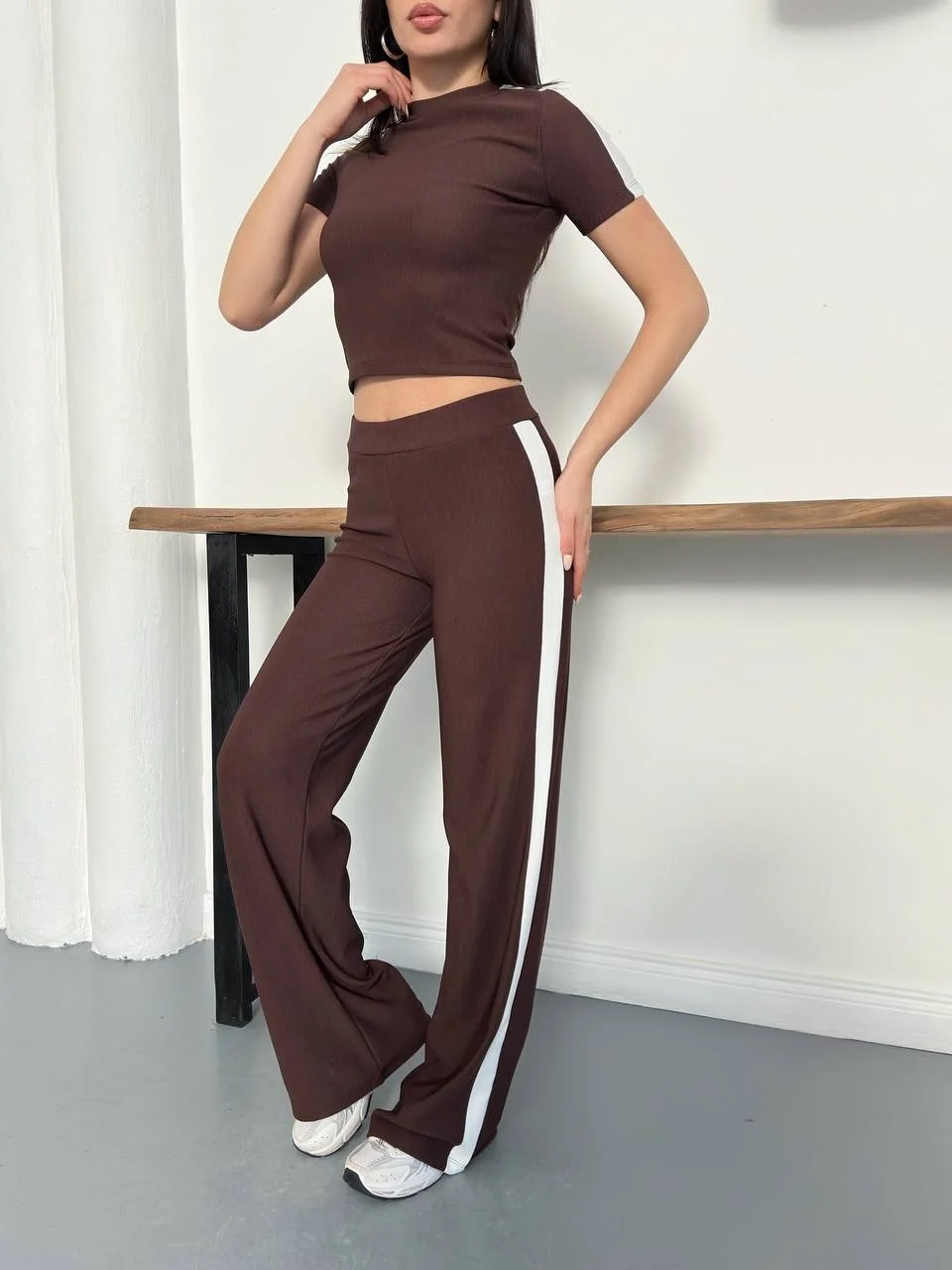 Kahve Yan Şerit Detaylı Yüksek Bel Bol Paça Tayt Takım