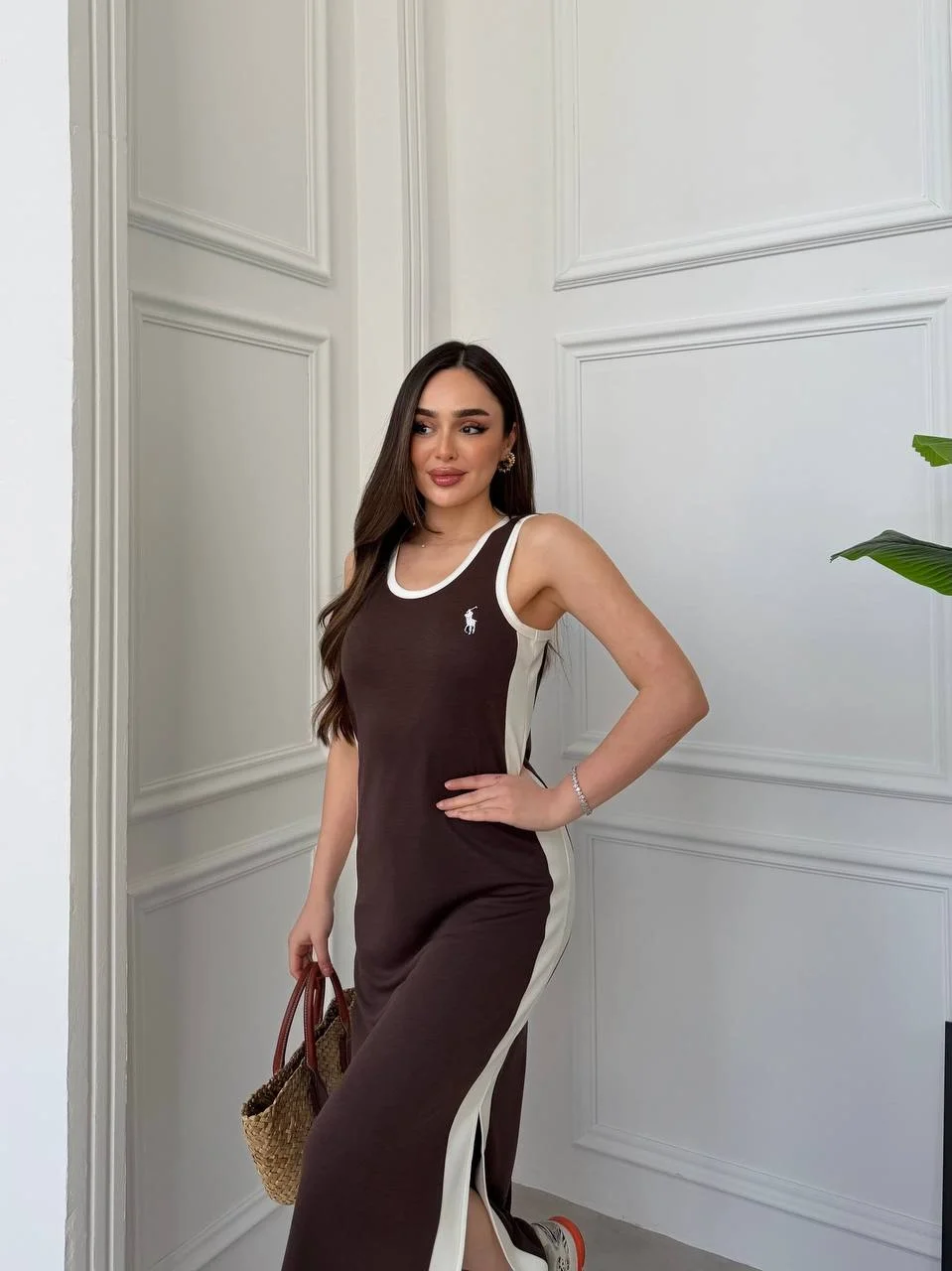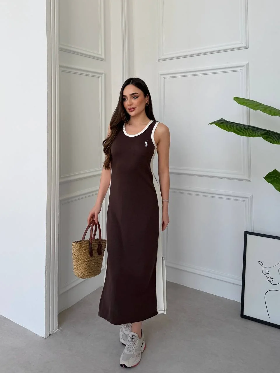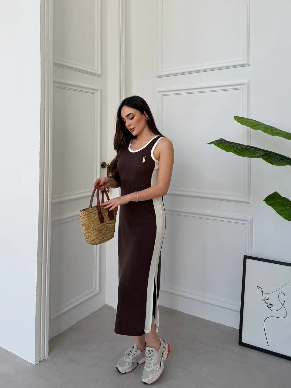 Kahve Yan Şeritli Atlet Model Uzun Elbise