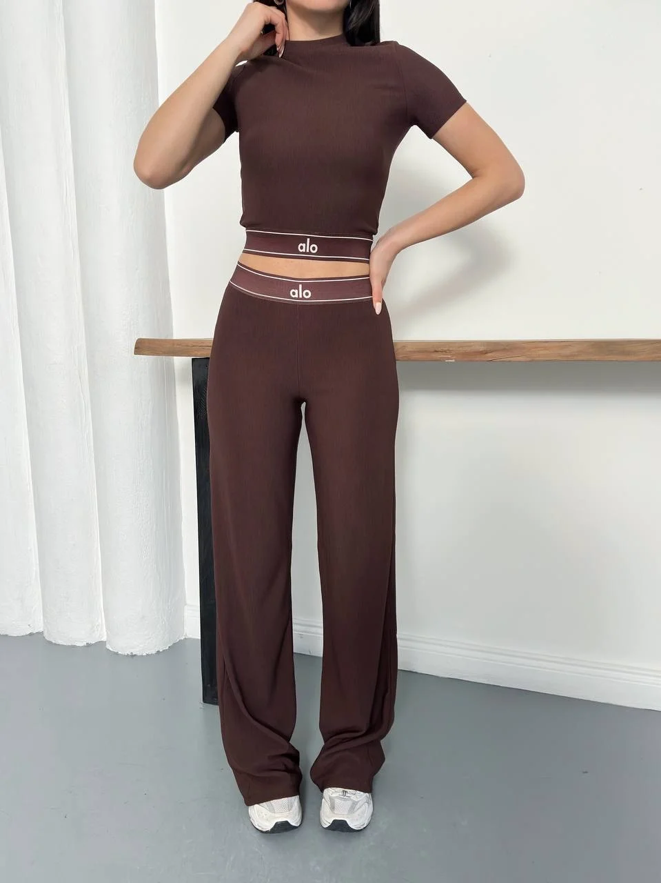 Kahve Yüksek Bel Çift Bantlı Flare Tayt Takımı