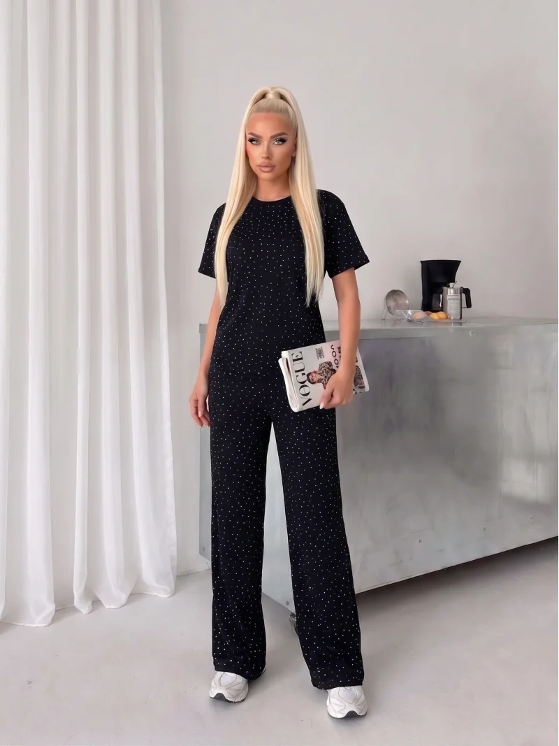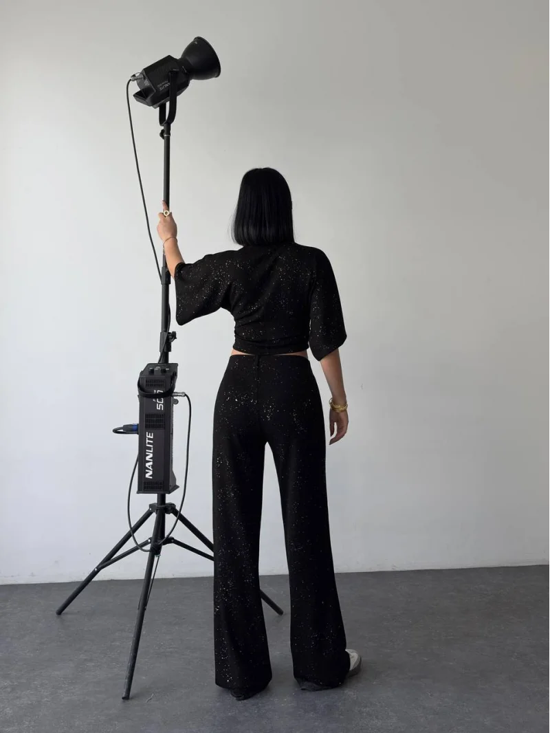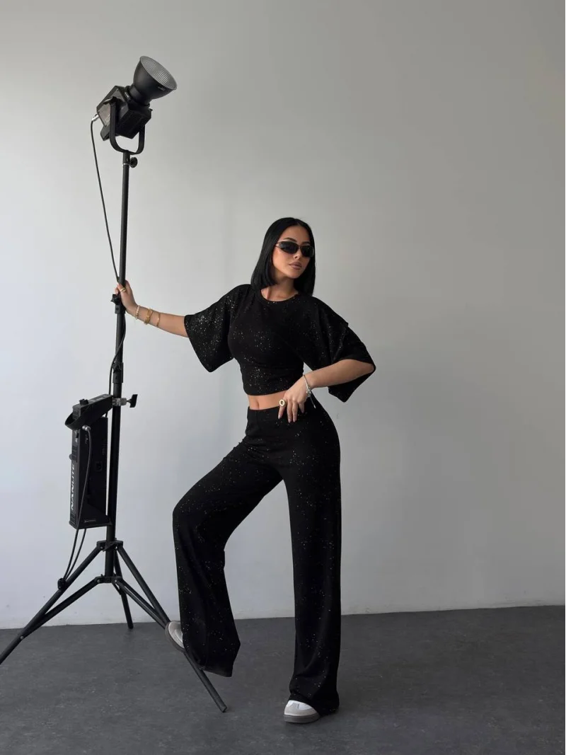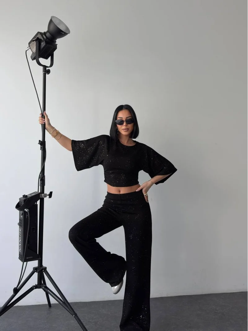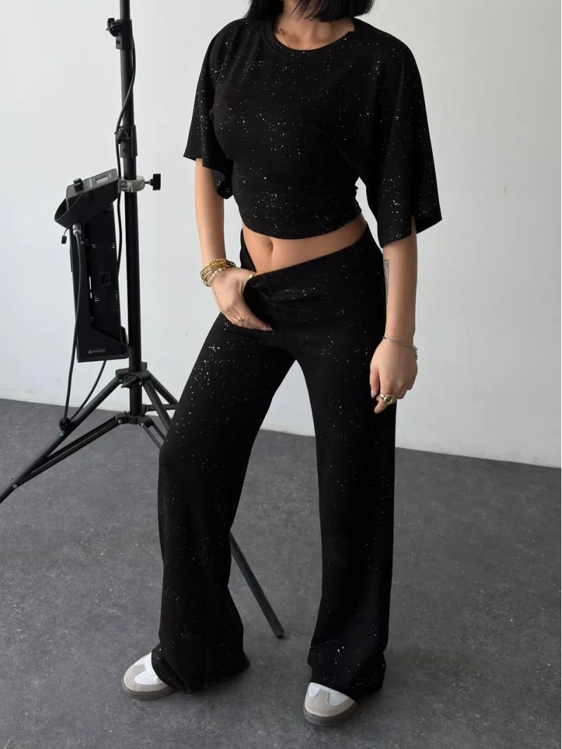 Siyah Gece Işıltılı Simli Crop Takım
