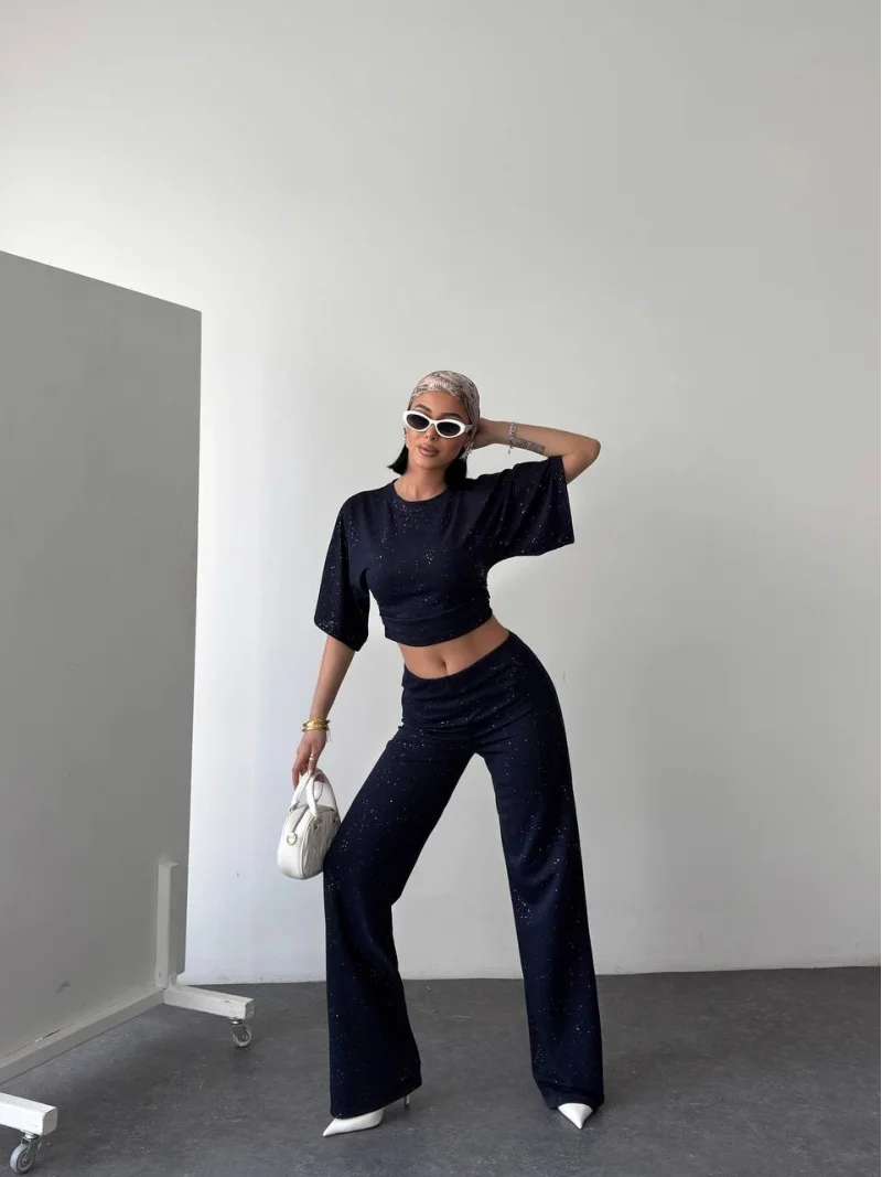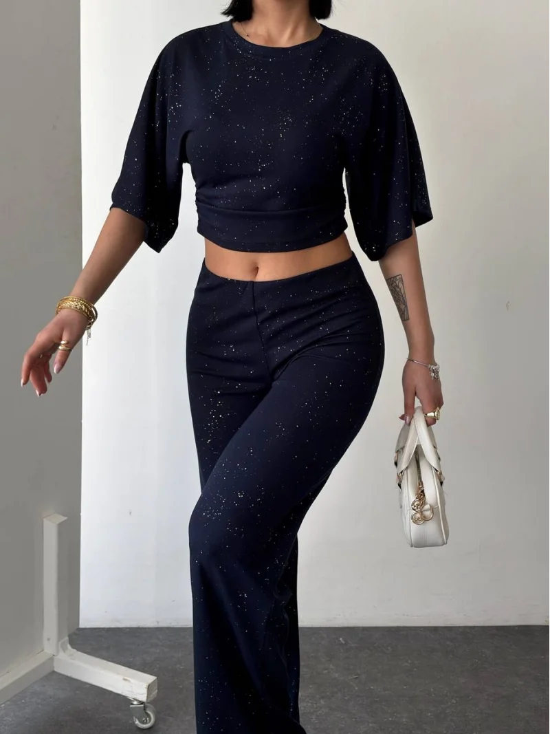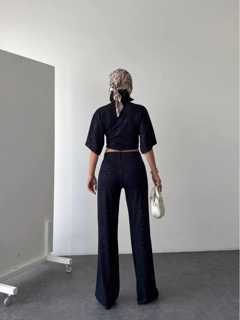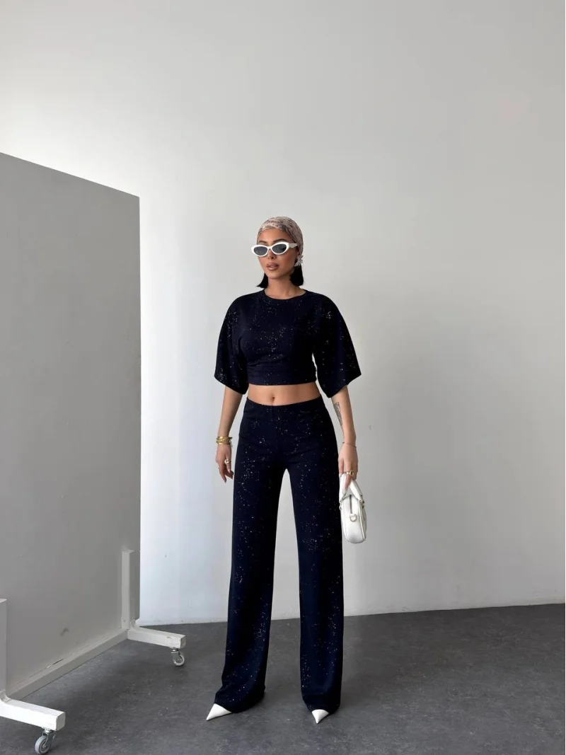 Lacivert Gece Işıltılı Simli Crop Takım