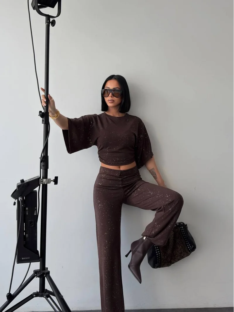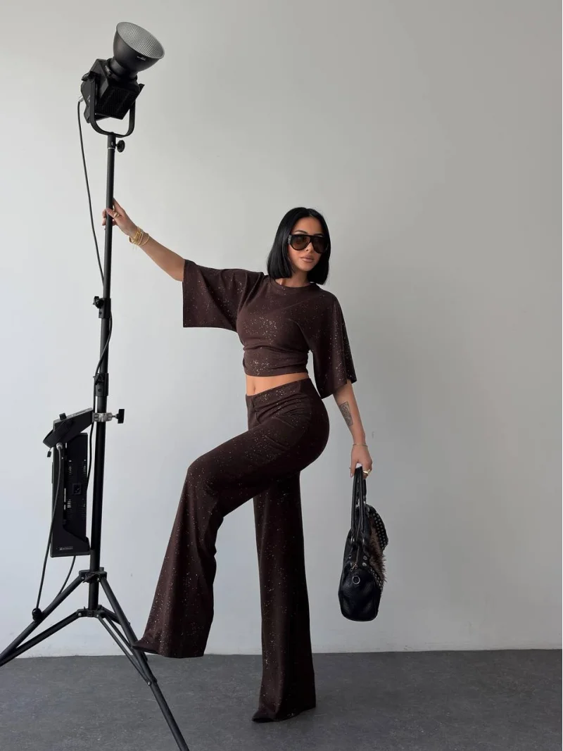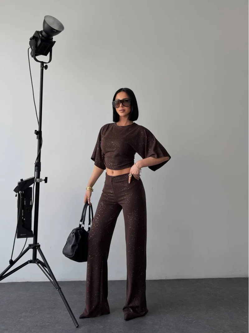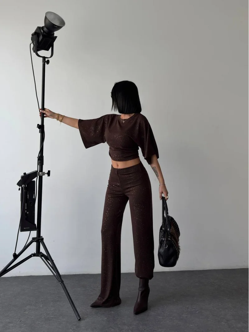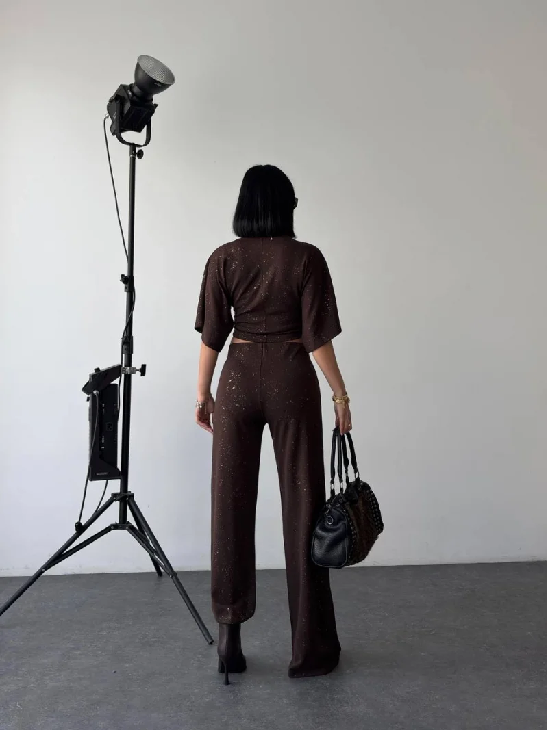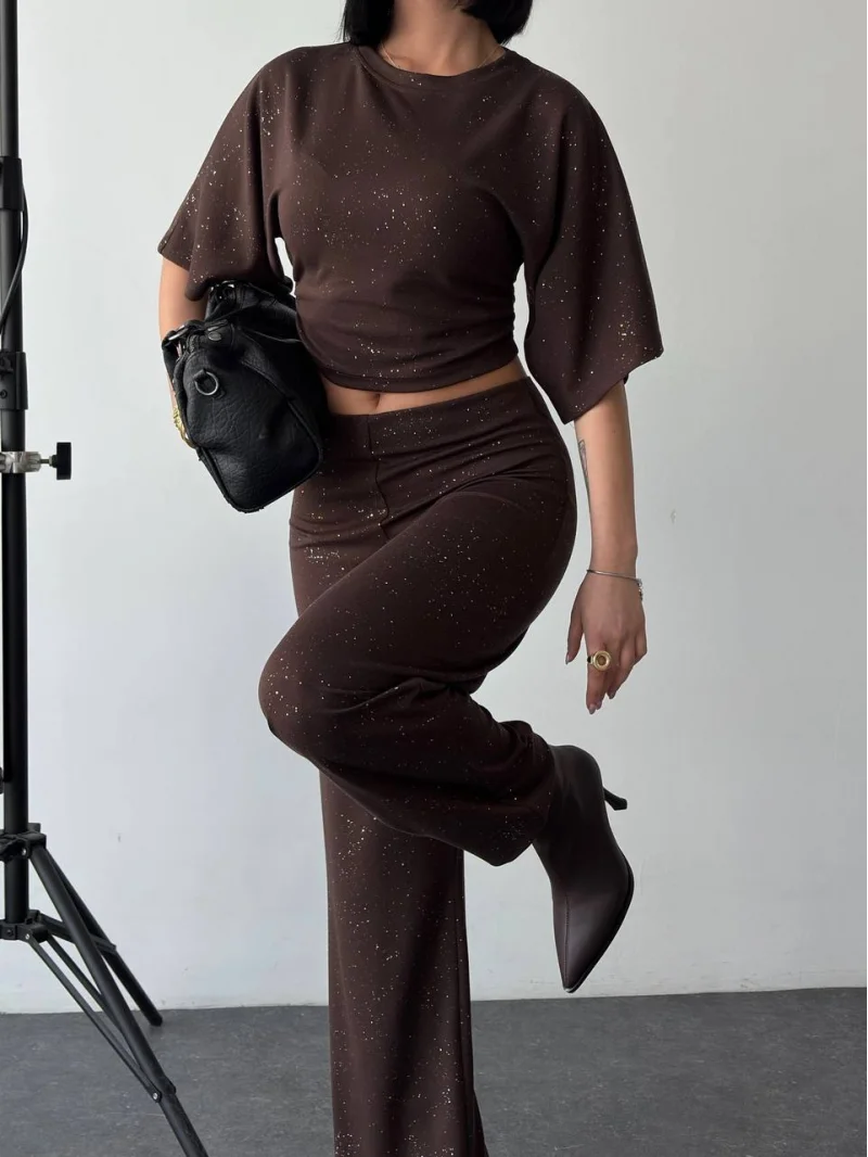 Kahve Gece Işıltılı Simli Crop Takım