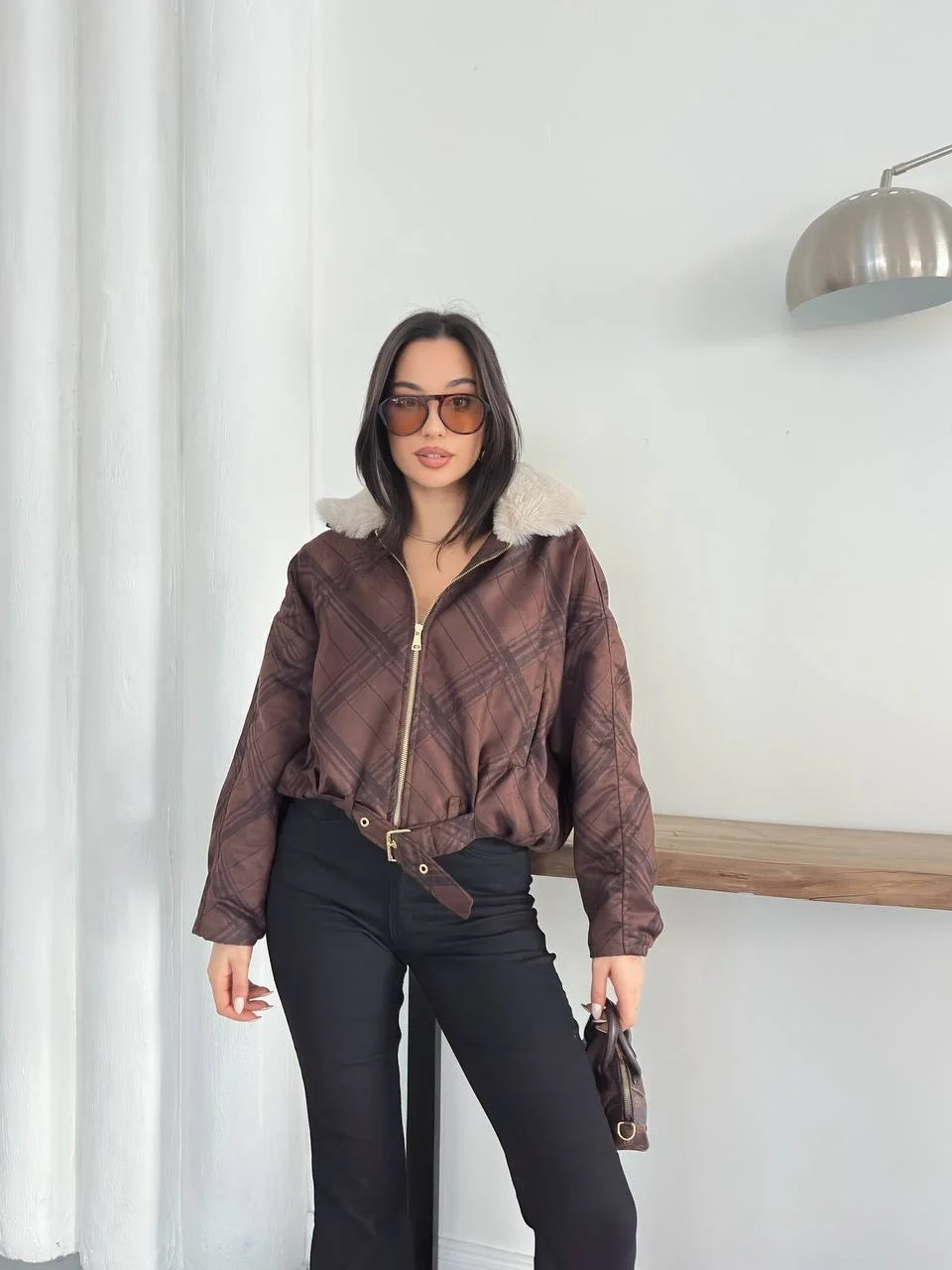 Koyu Kahve Kemer Detaylı Yakası Kürklü Premium Ceket