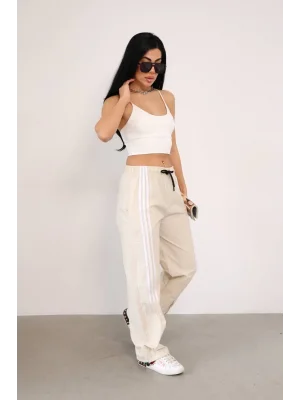 Modaskop'un Krem Çift Şerit Kargo Cep Paraşüt Eşofmanı ile rahatlık ve şıklığı bir arada bulacaksınız.