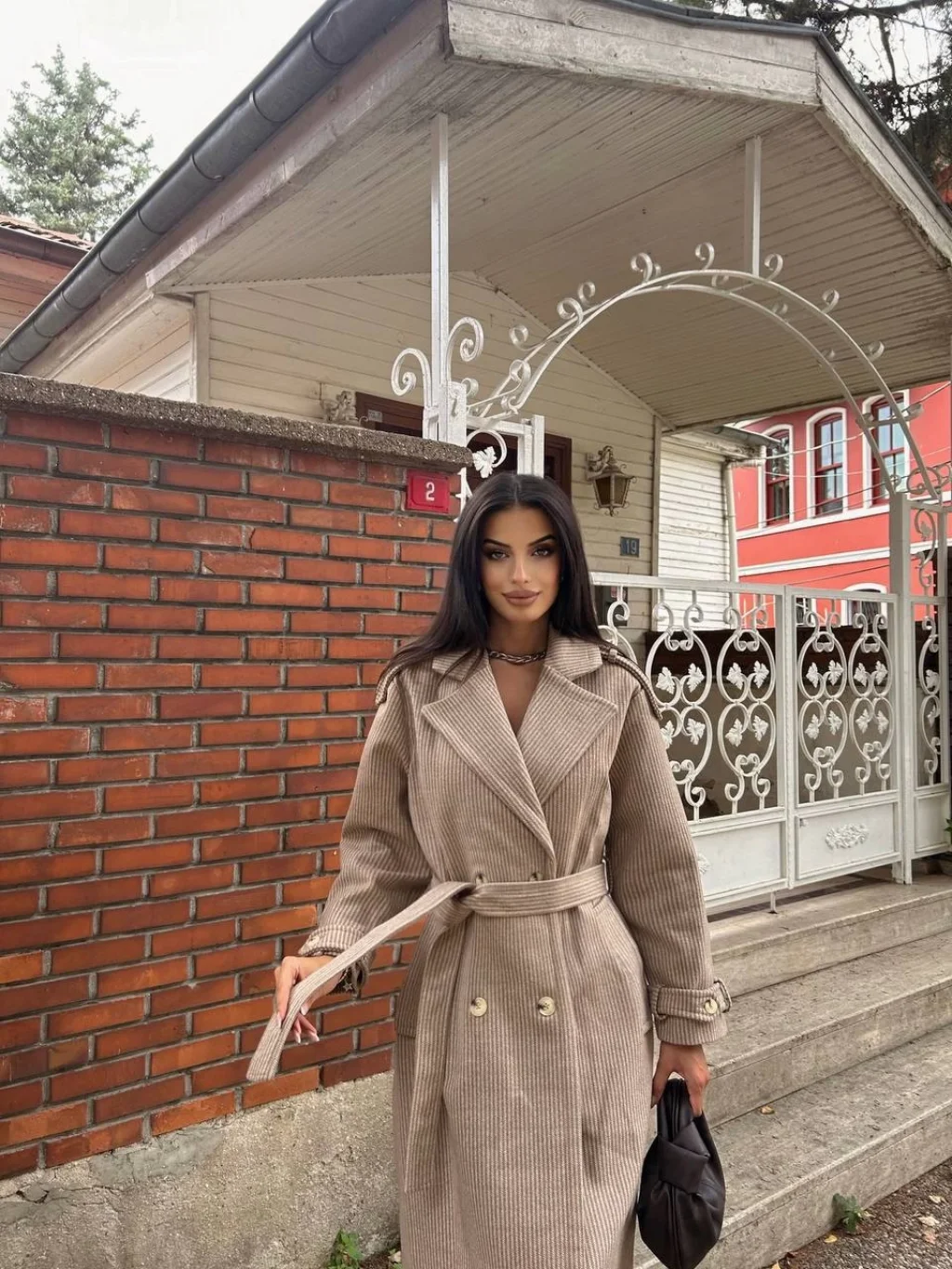 • Krem Kuşaklı Astarlı Apoletli Kaban
