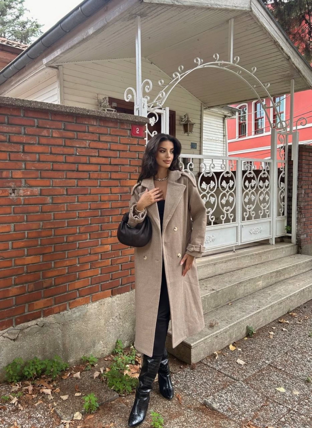Beyaz Kuşaklı Astarlı Apoletli Kaban