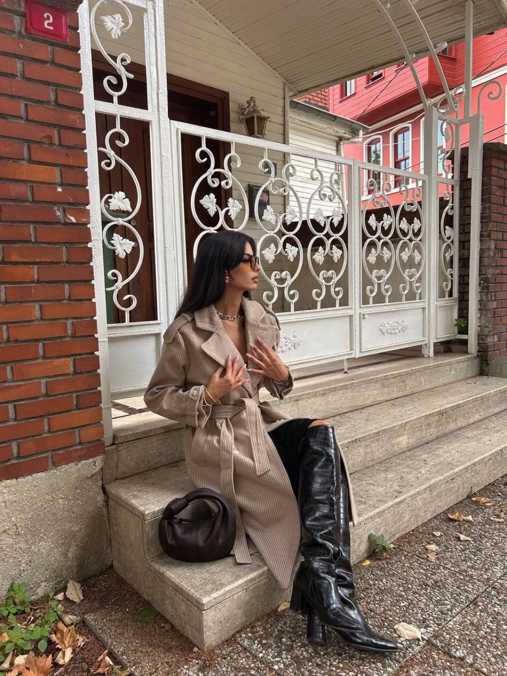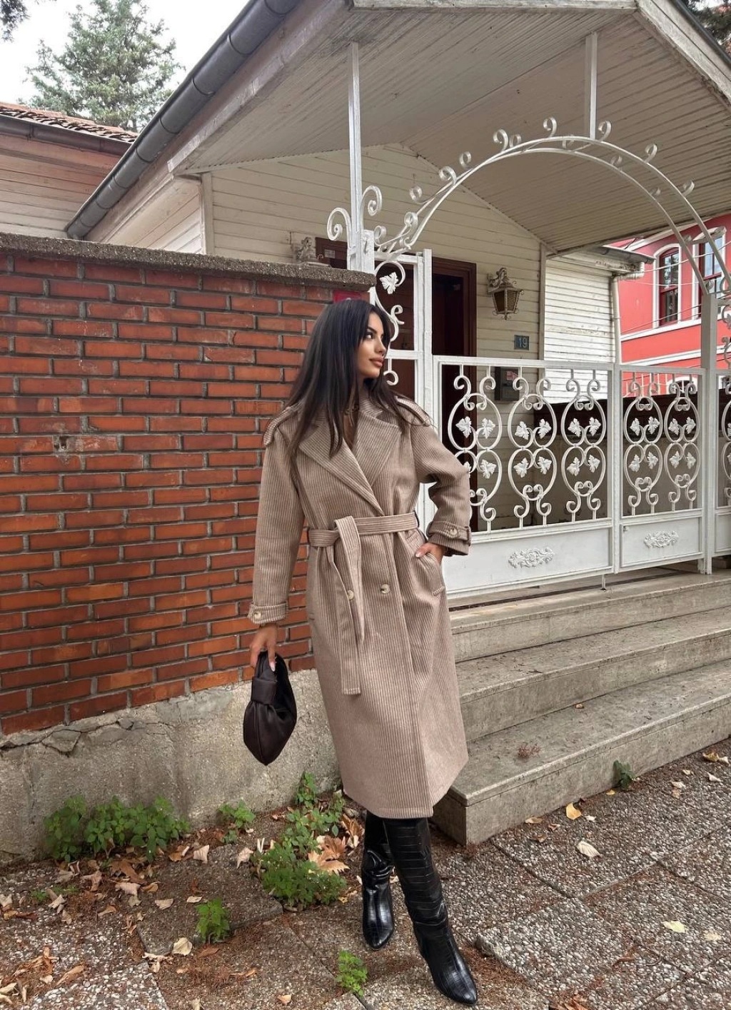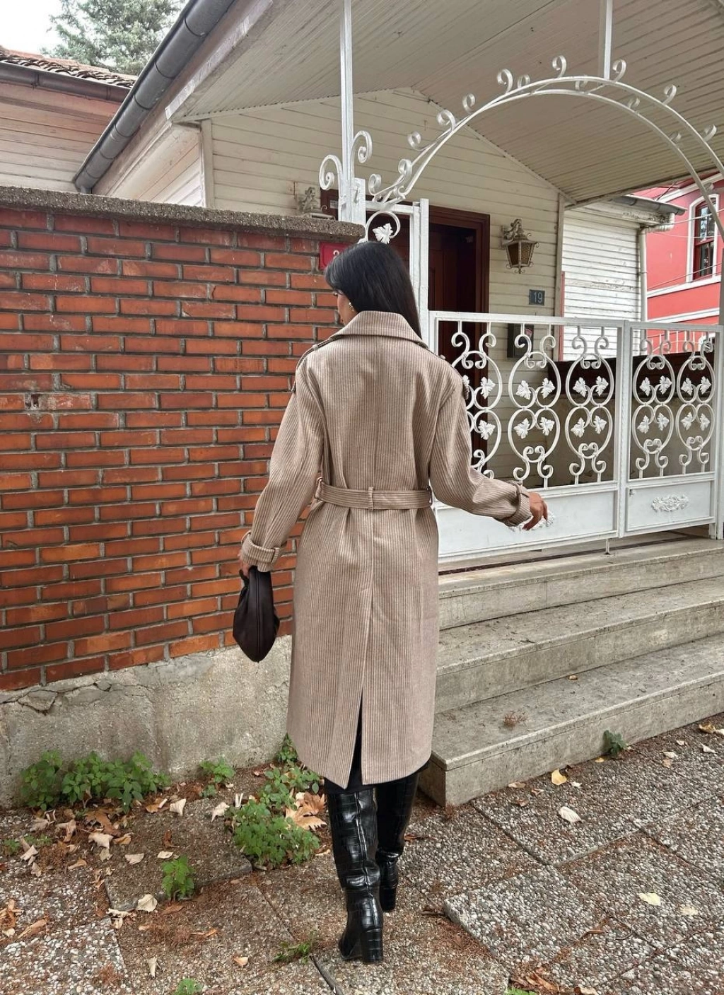 Krem Kuşaklı Astarlı Apoletli Kaban