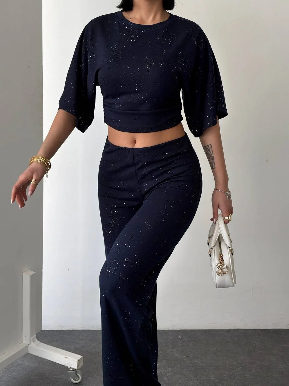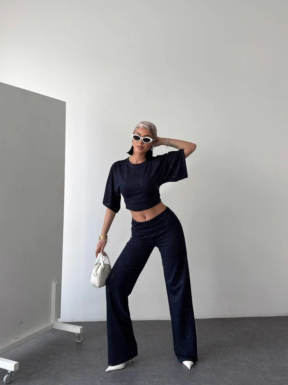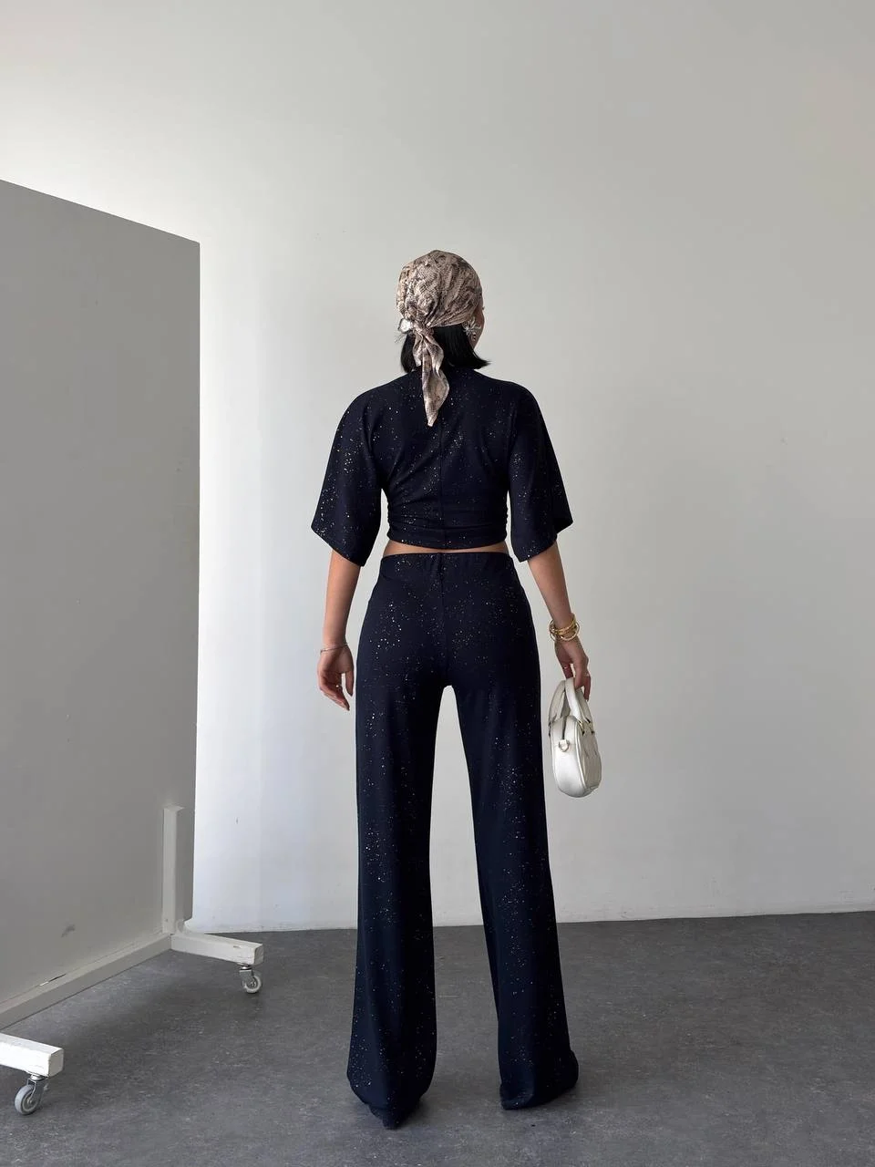 • Lacivert Gece Işıltılı Simli Crop Takım