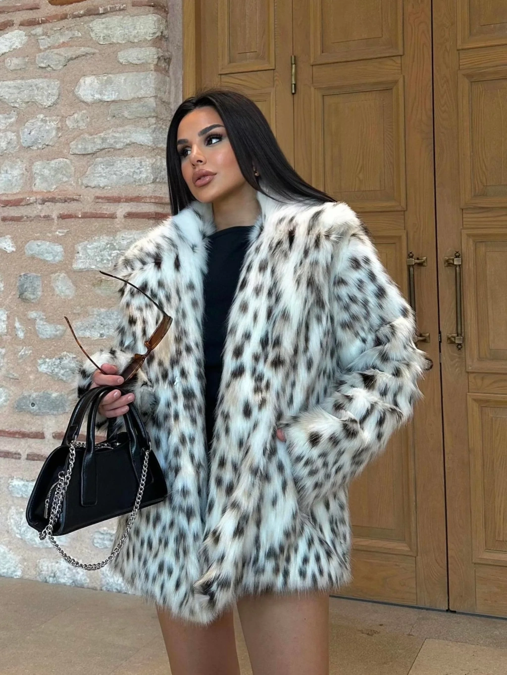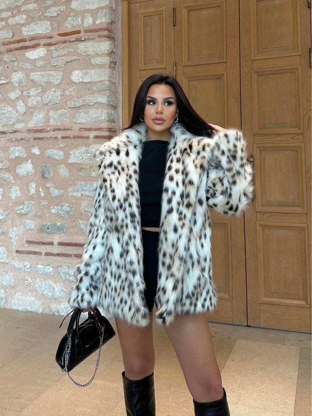 Leopar Ceket Yaka İçi Satarlı Uzun Kürk Kaban