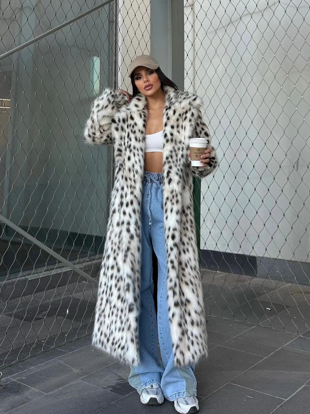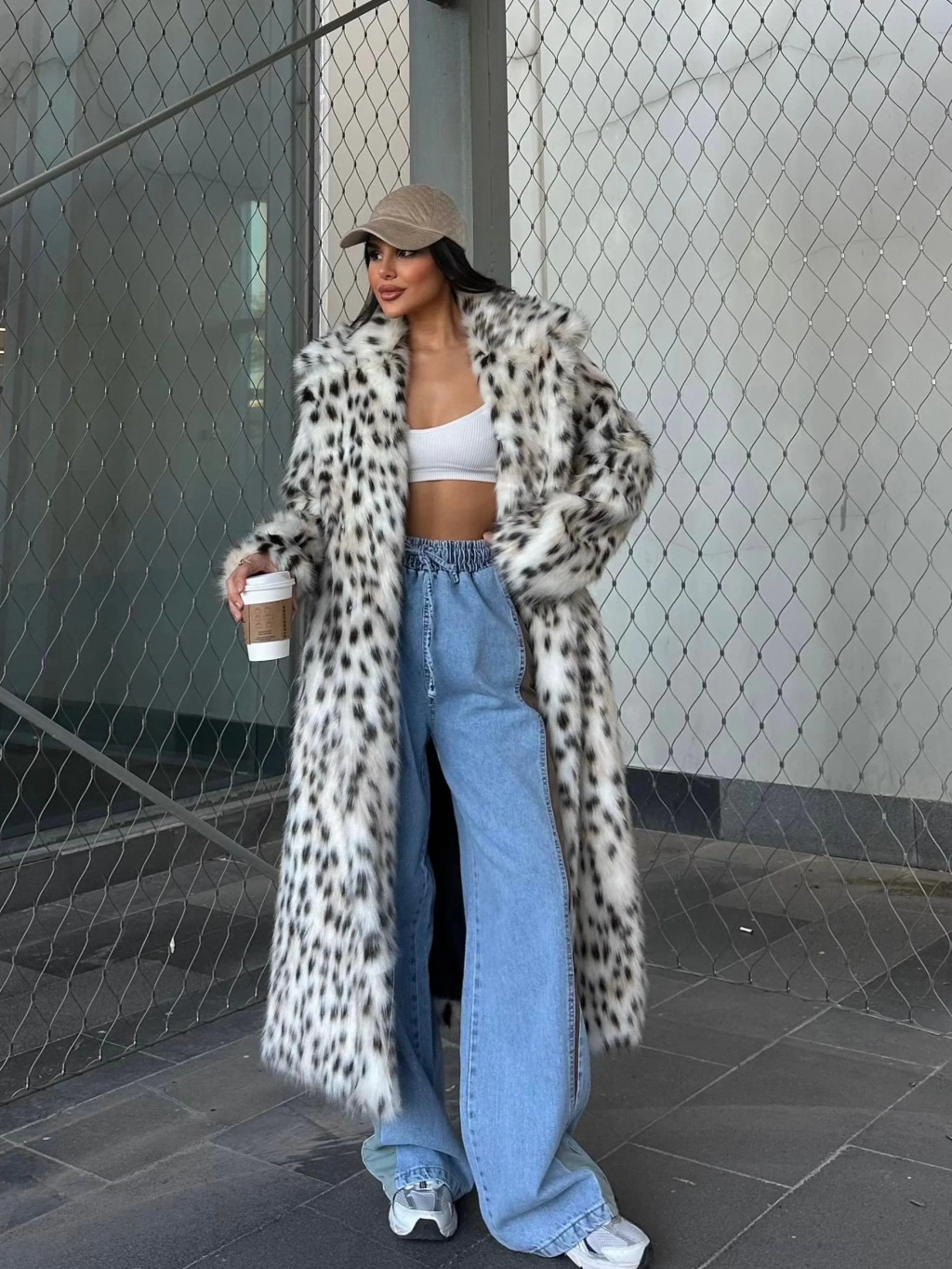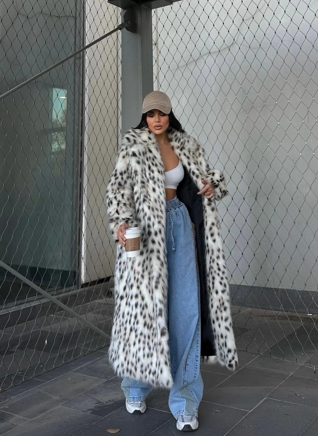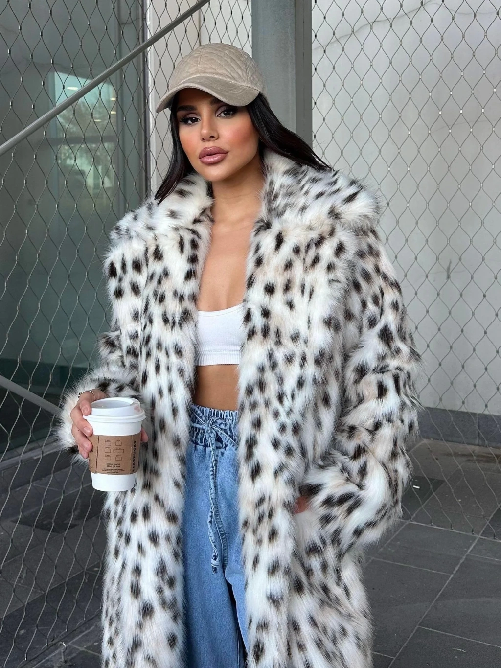 Beyaz Leopar Ceket Yaka İçi Satarlı Uzun Kürk Kaban