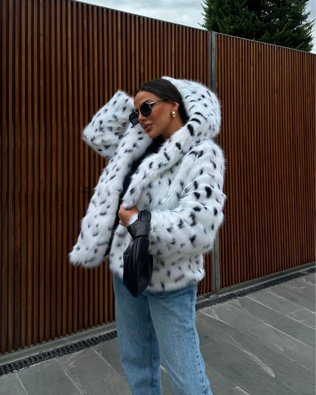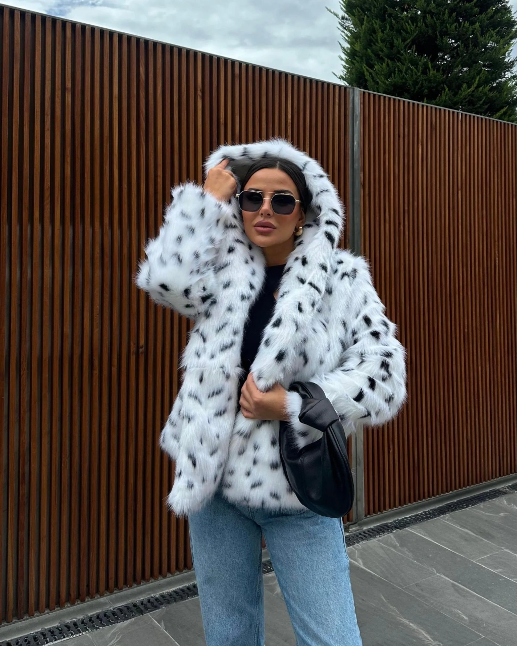 Leopar Kapşonlu İçi Astarlı İthal Kürk Kaban