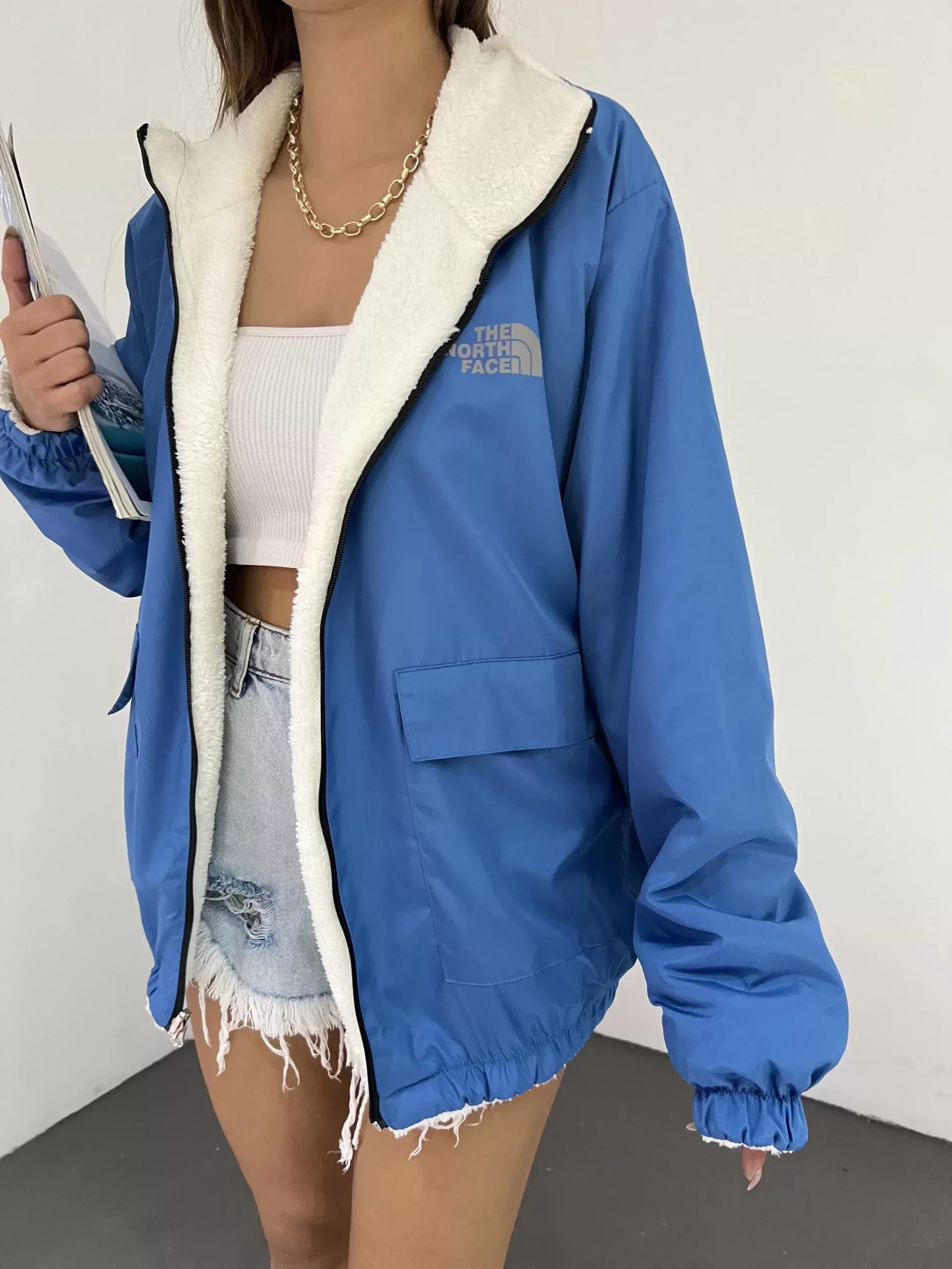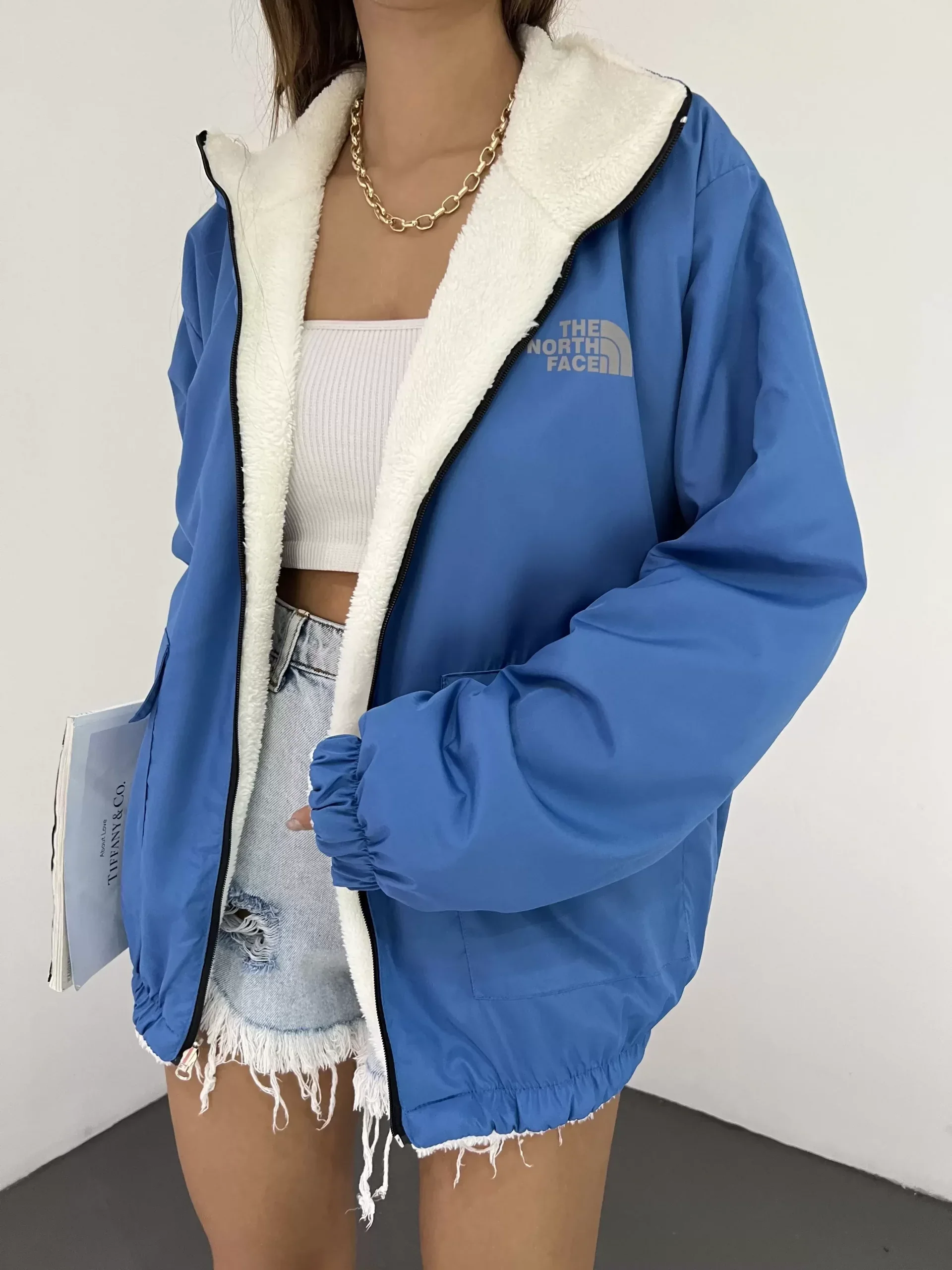 Mavi Çift Taraflı Giyilebilir Kürklü Mont