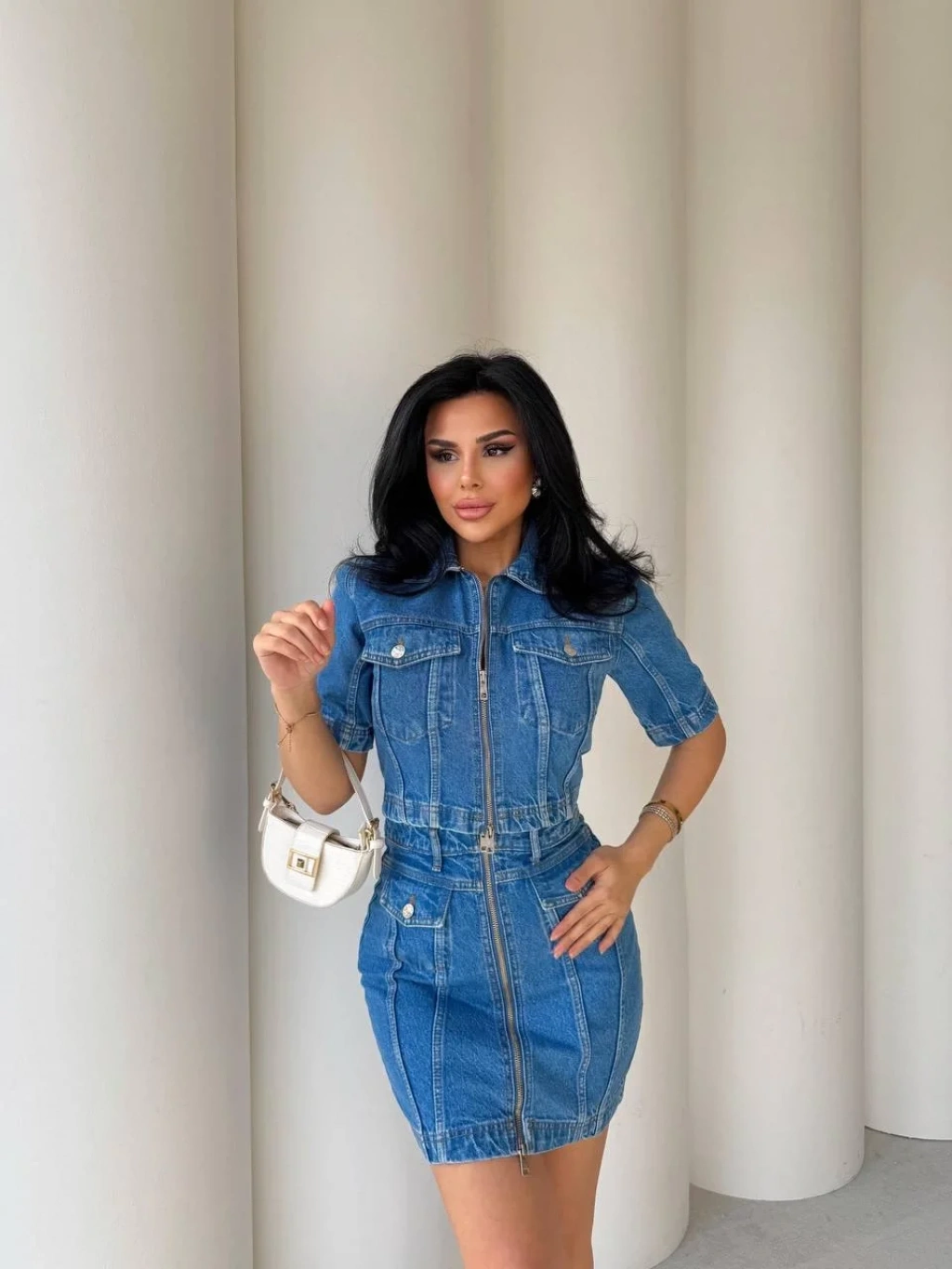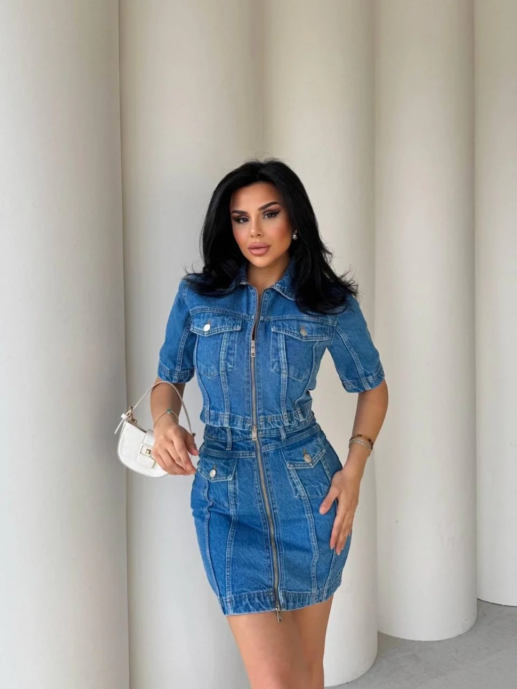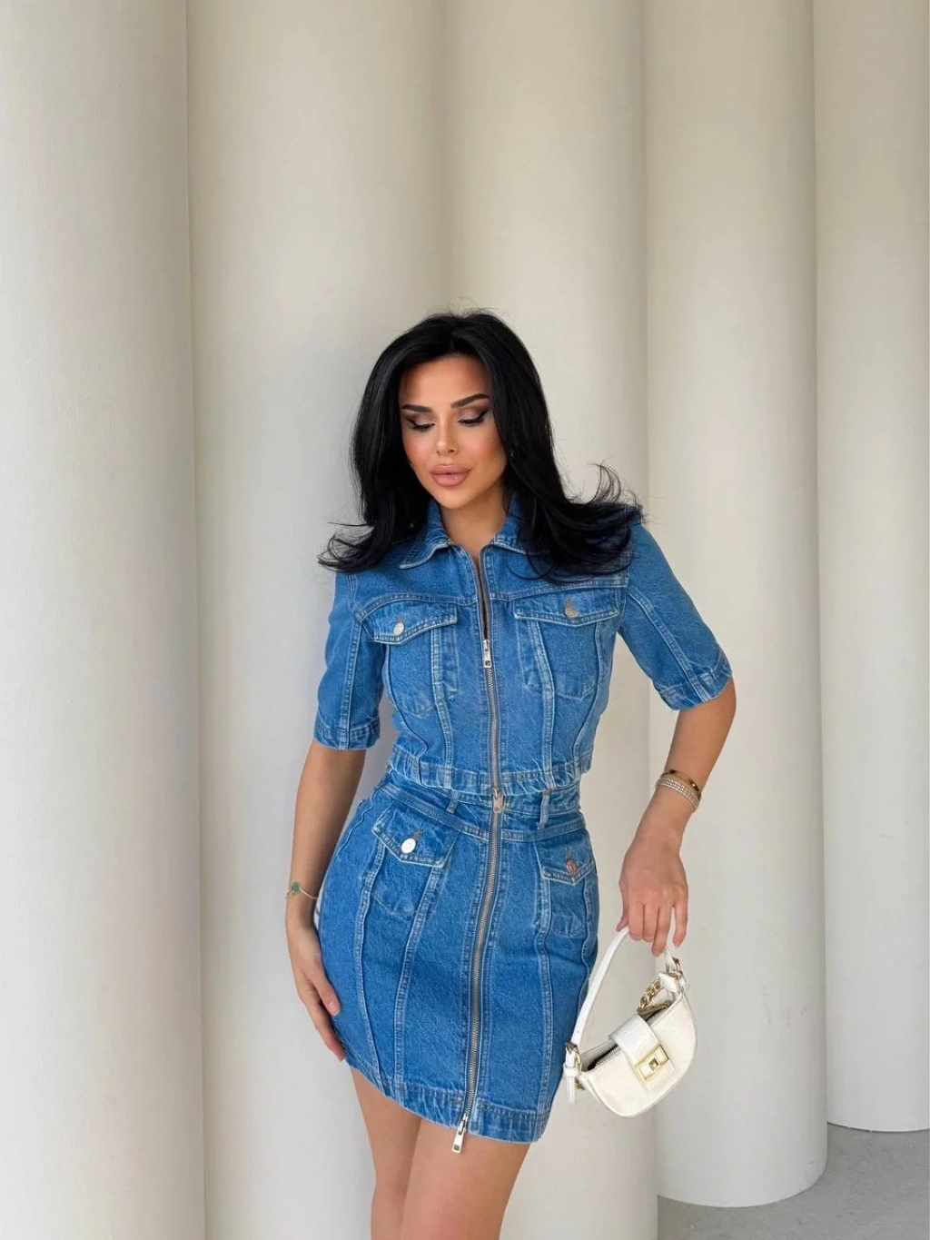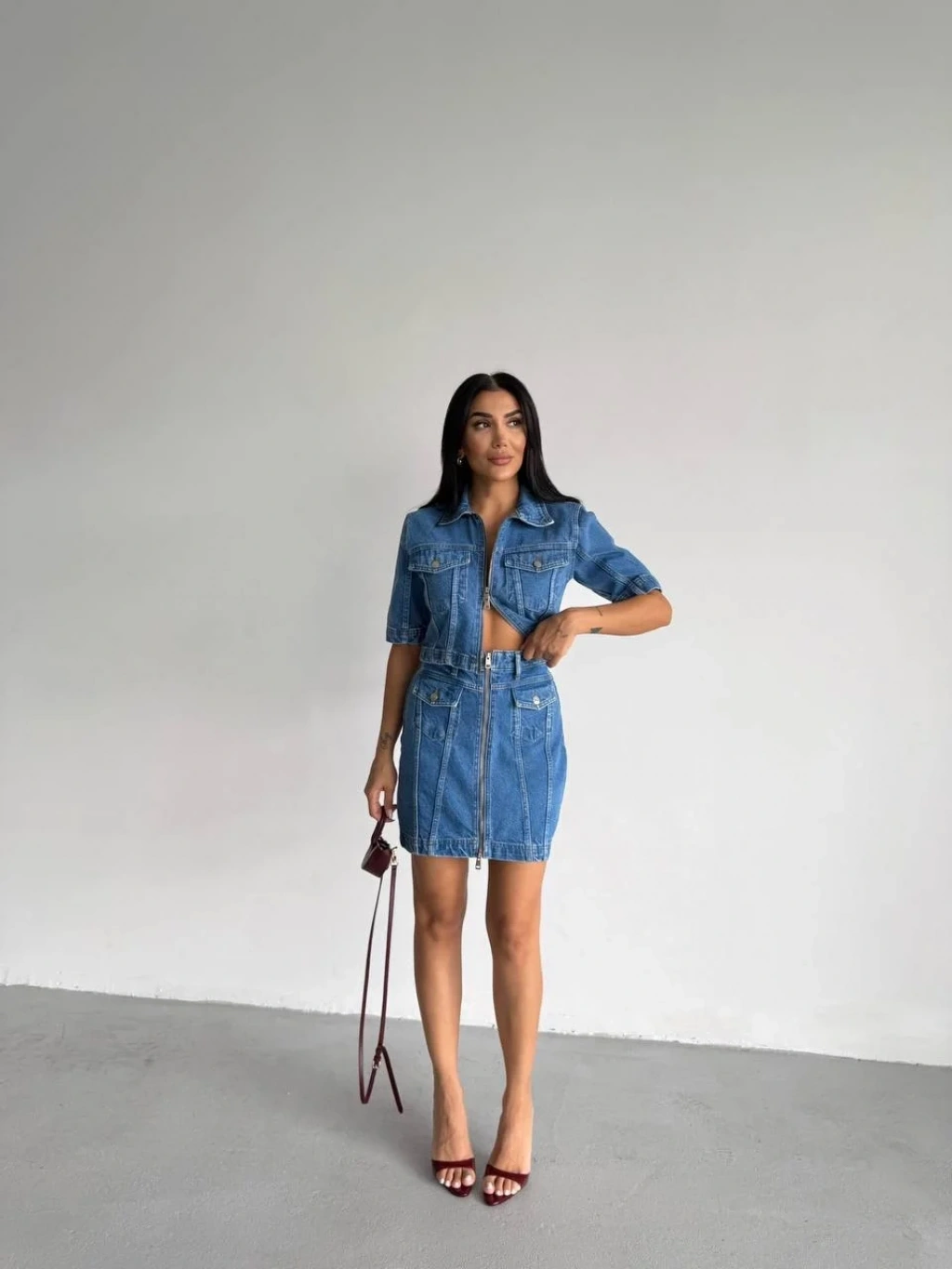 Modaskop Mavi Denim Fermuarlı Etekli Takım, stilinizi tamamlayacak şık ve modern bir kombin seçeneğidir.