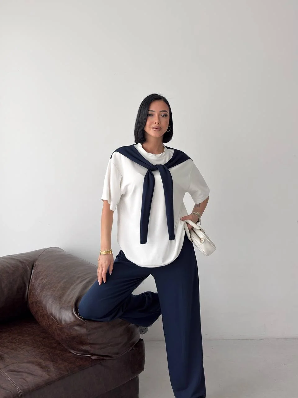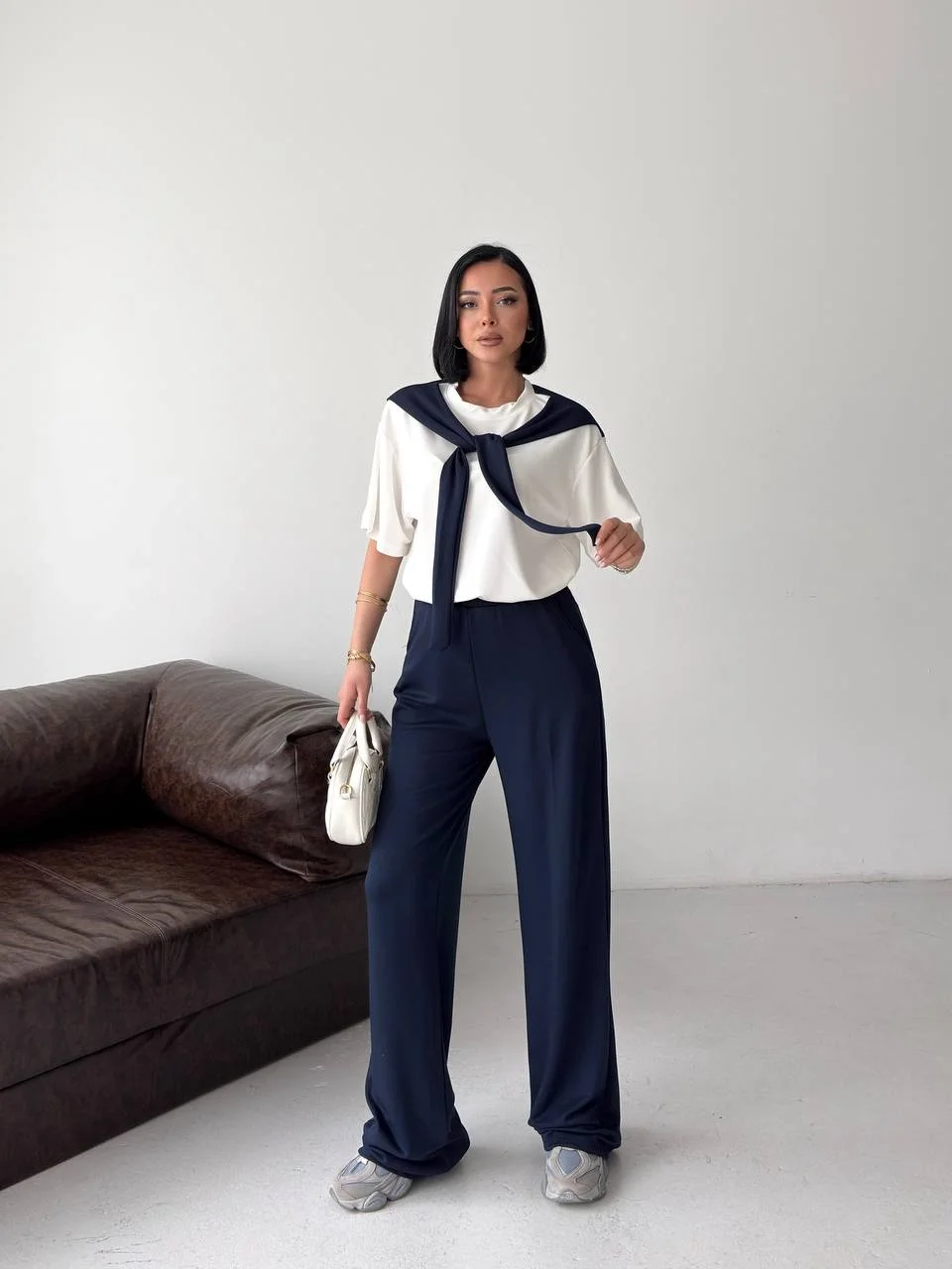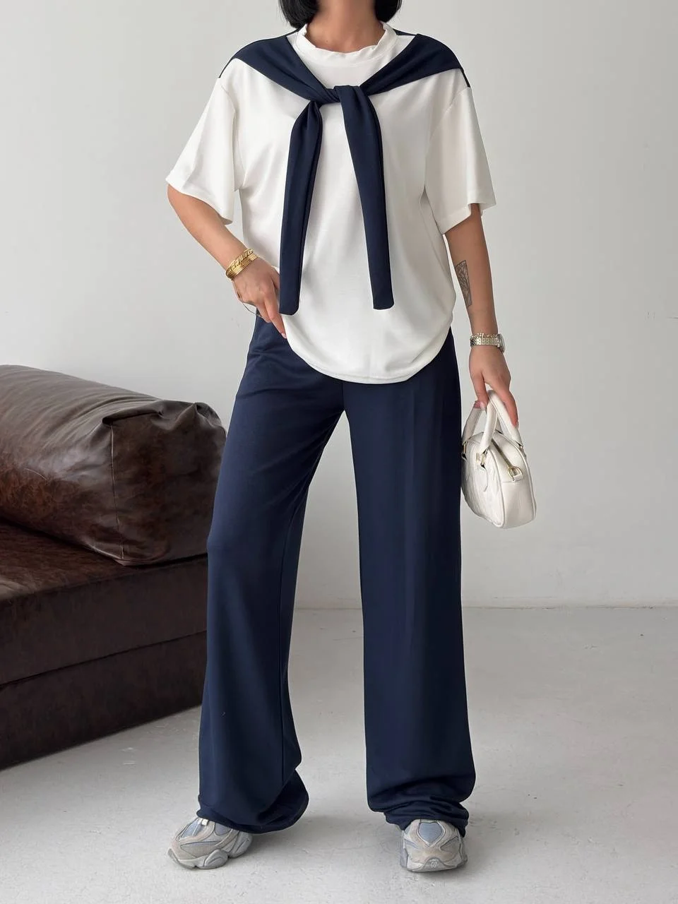 Mavi Rahat Takım – Basic Tişört & Yüksek Bel Salaş Pantolon Kombini