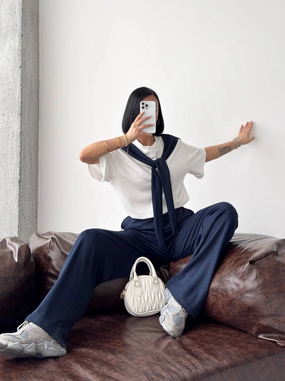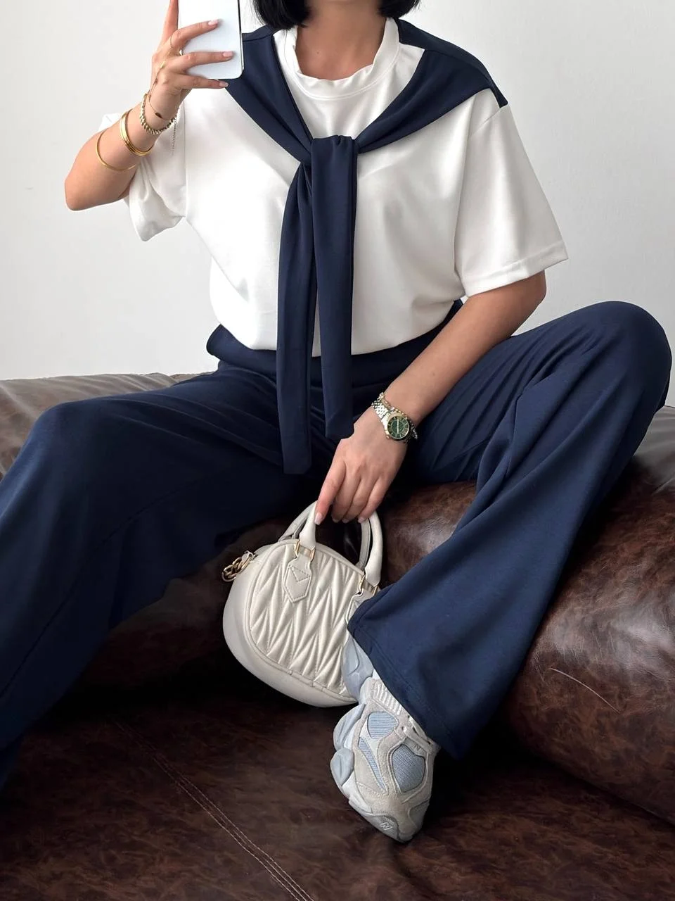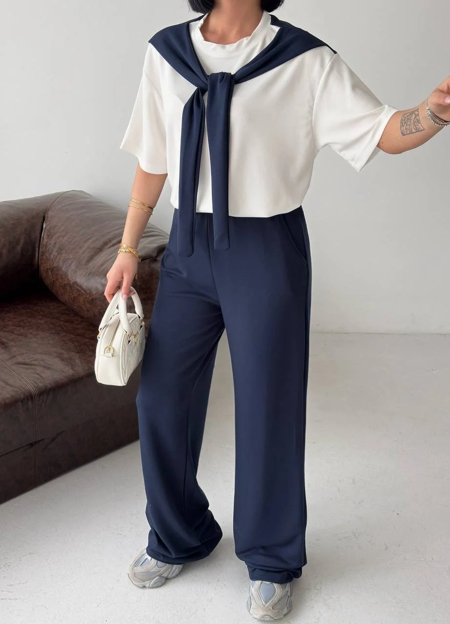 Mavi Rahat Takım – Basic Tişört & Yüksek Bel Salaş Pantolon Kombini