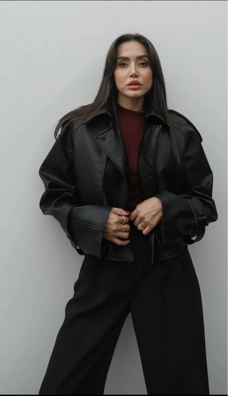 Siyah Kol Detaylı Zarif Deri Mont