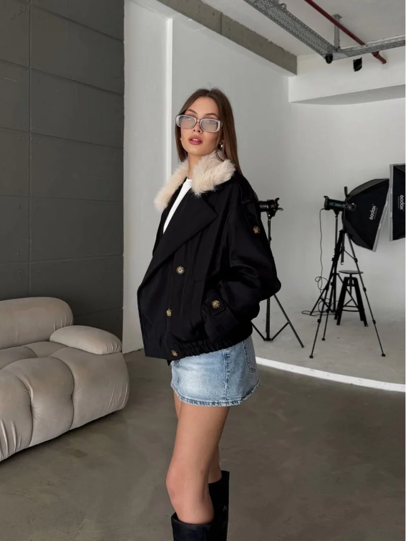 Siyah Özel Üretim Yaka Kürklü
