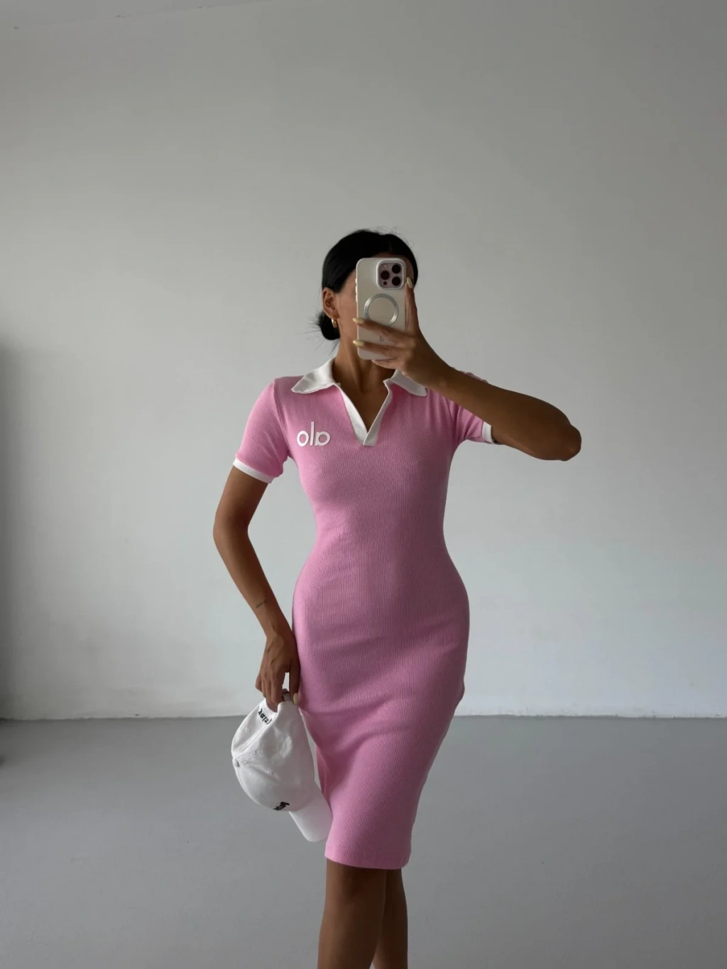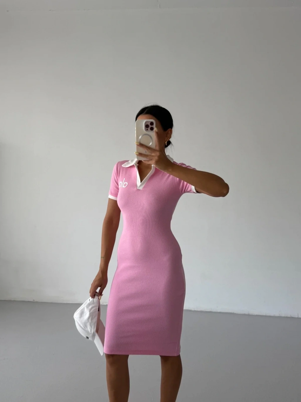 Pembe Alo Polo Yaka Likralı Kaşkorse Elbise, şıklığı ve konforu bir arada sunar.