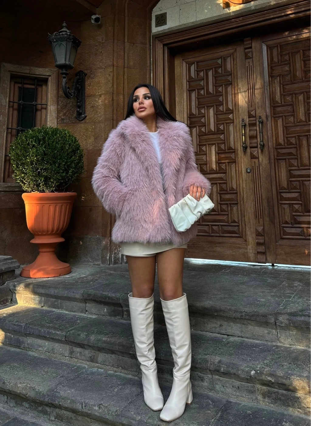 Beyaz Leopar Ceket Yaka İçi Satarlı Uzun Kürk Kaban