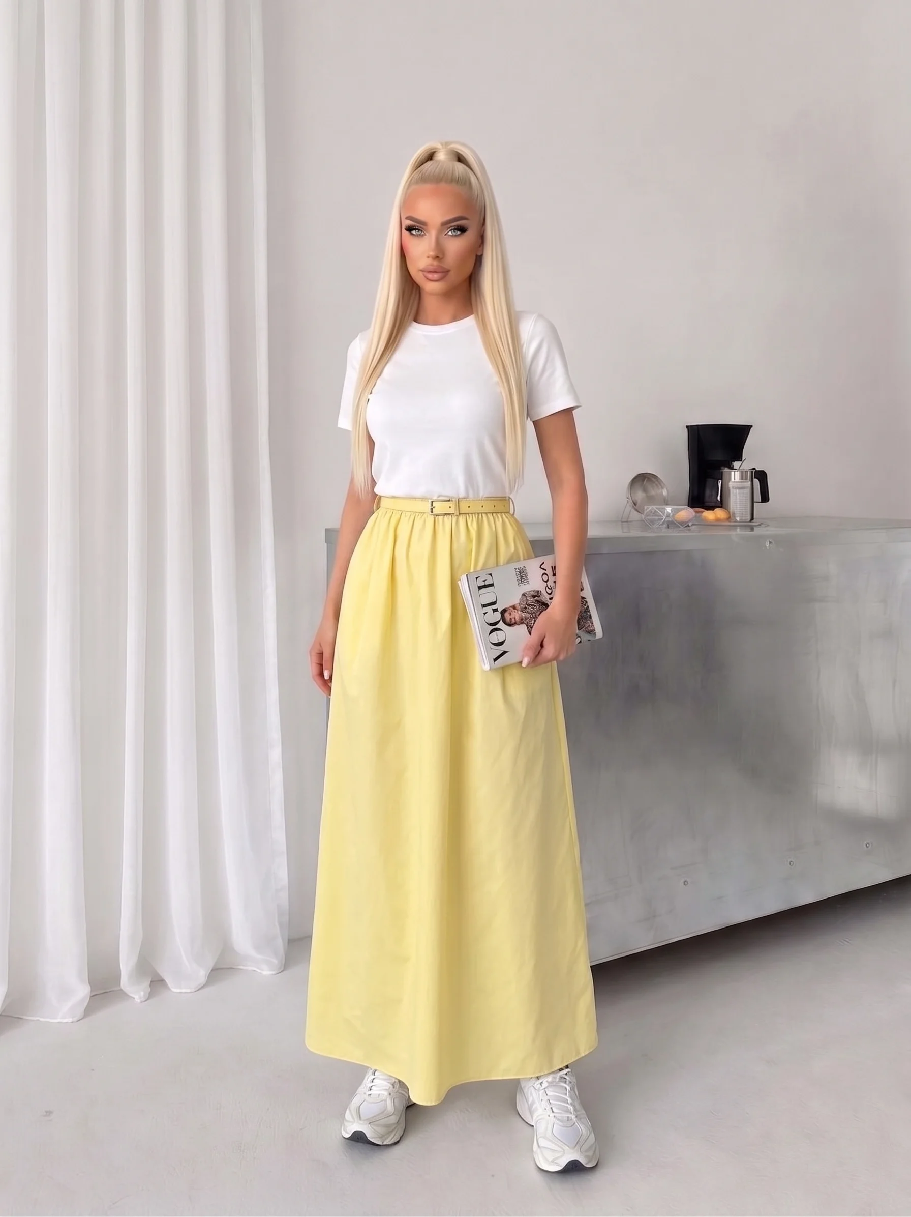 • Sarı Poplin Kemer Detay Etekli Elbise