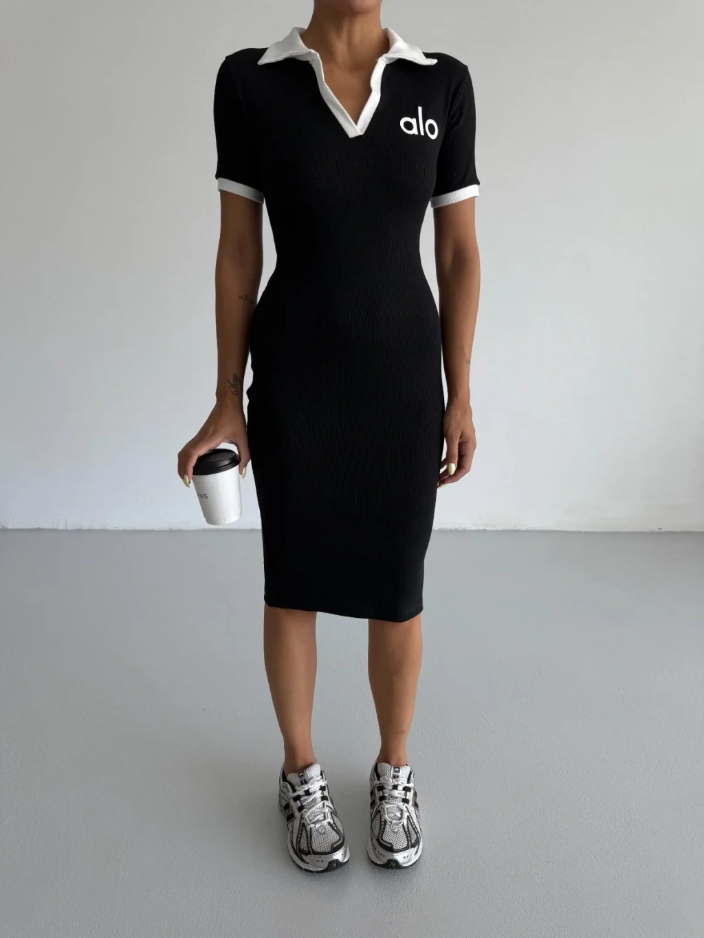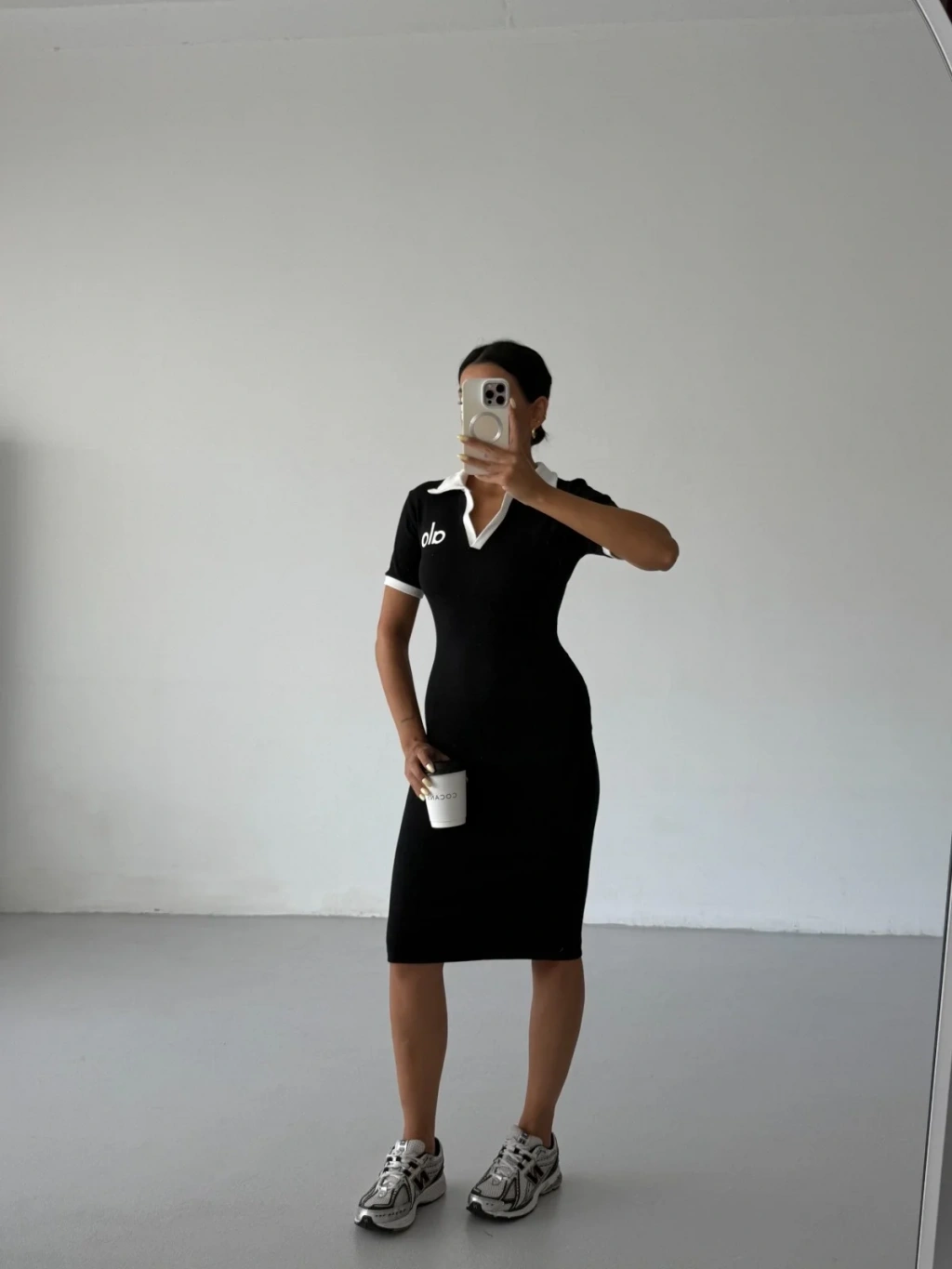 İkonik siyah renk, şık polo yaka ve likralı kumaşıyla dikkat çeken Alo Polo Yaka Likralı Kaşkorse Elbise.